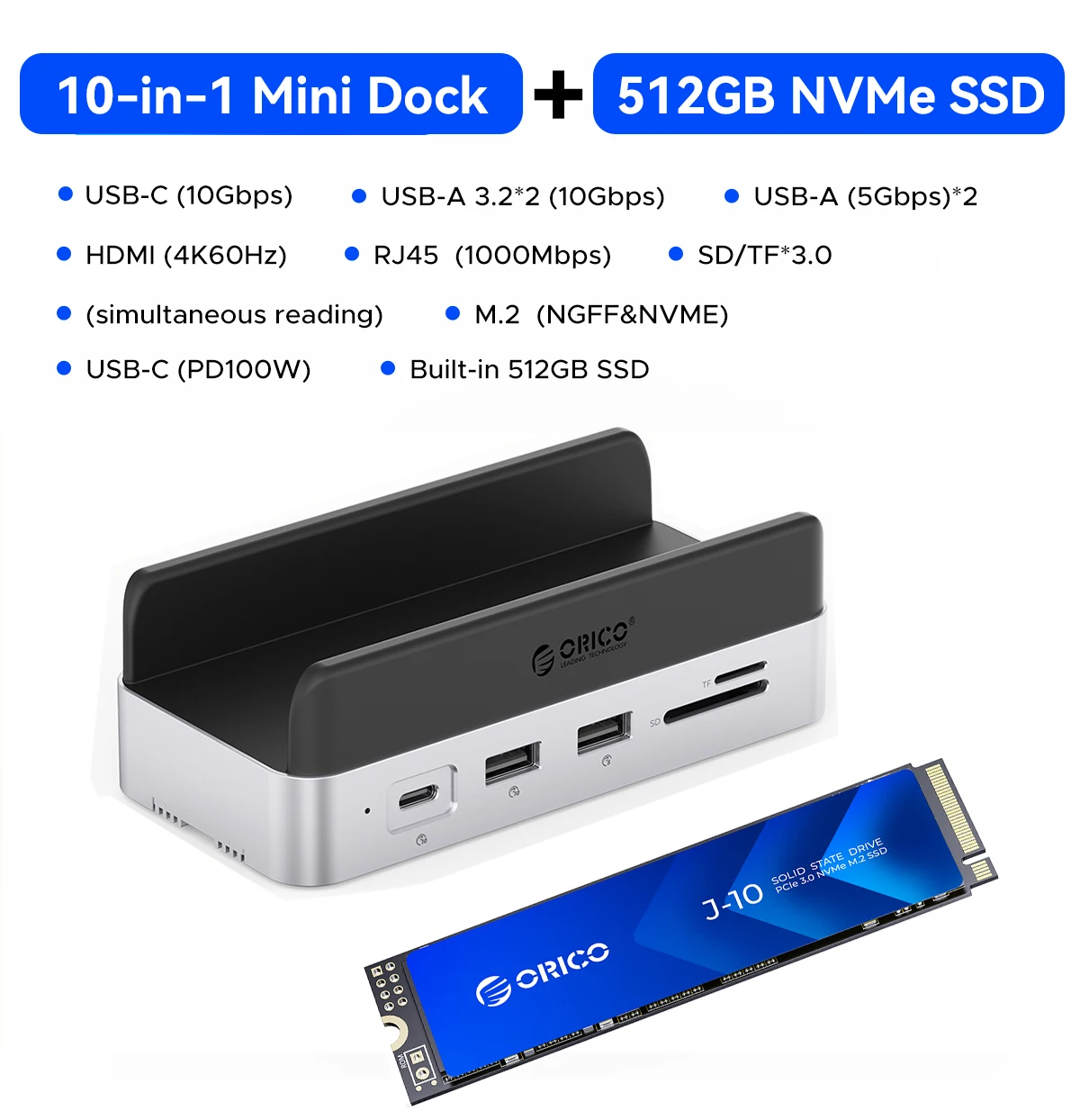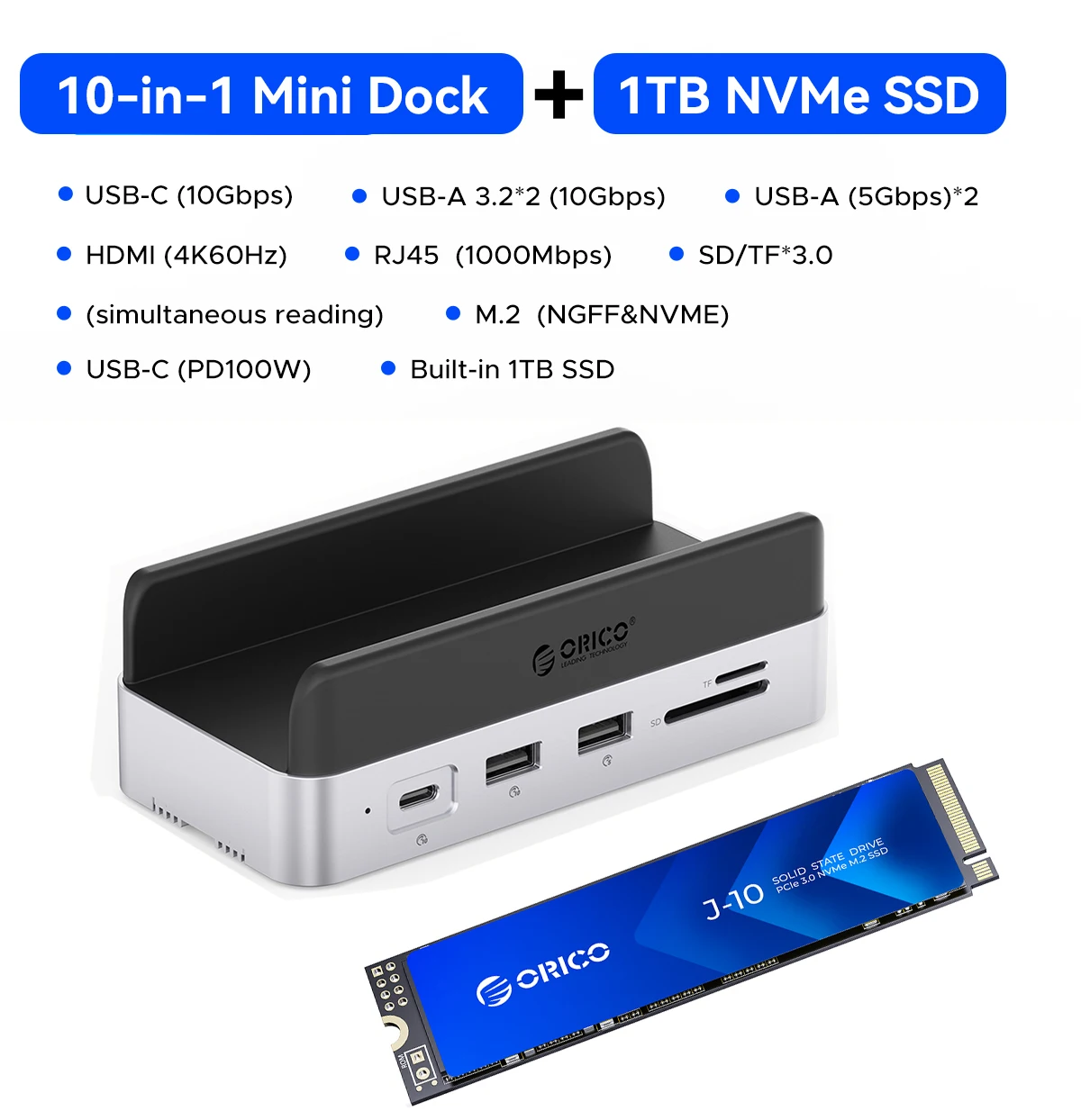 ORICO USB HUB MiniDock Expansion for Mini M4&M4 Pro Stand USB3.2 Gen2 Type C Docking Station with 4T 2T 1T M.2 NVME SSD Options