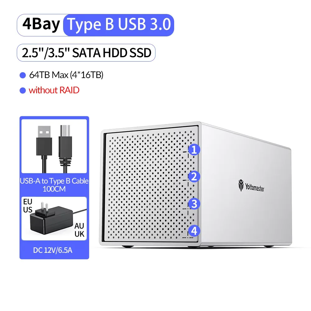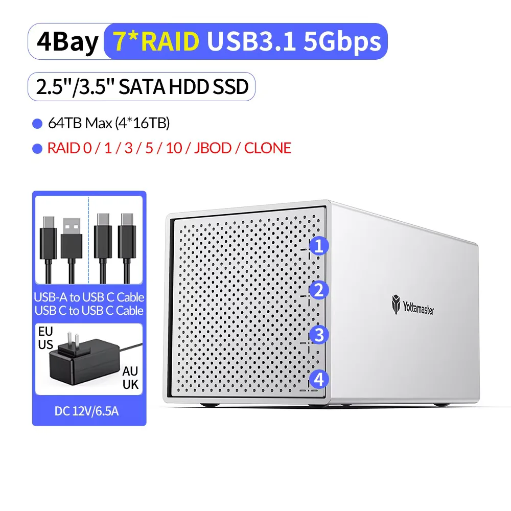 Yottamaster 4 Slot RAID Enclosure 4 Bay 2.5/3.5-inch USB3.0 to SATA3.0 RAID External HDD Array Enclosure Support 4x16TB and UASP