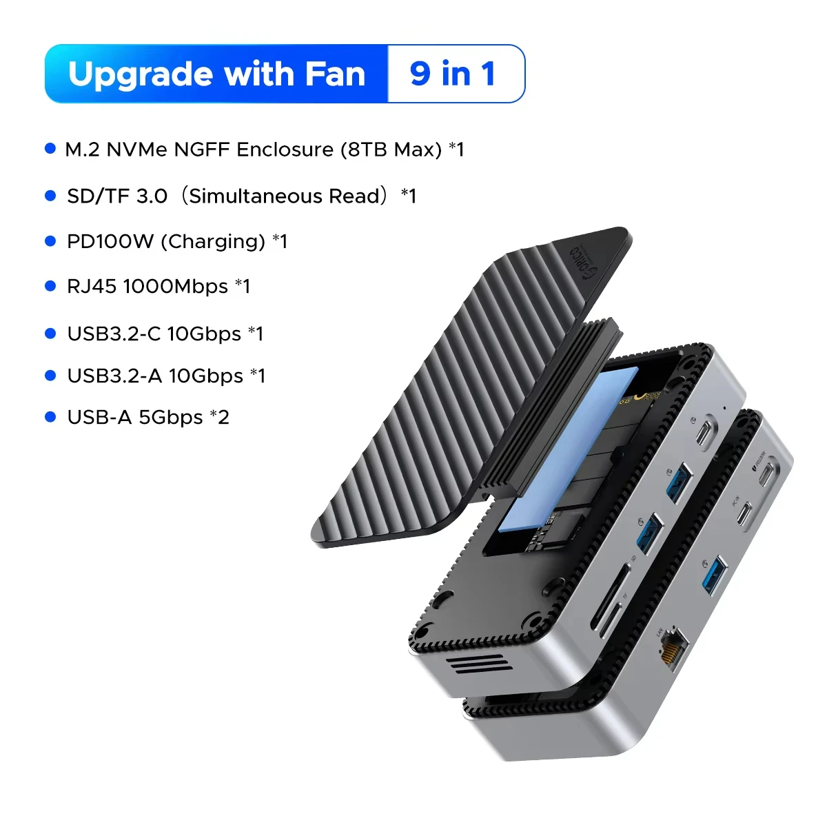 ORICO 4K 60Hz HDMI PD100W USB Type C HUB with Cooling Fan 10Gbps M.2 NVMe SATA SSD Enclosure External RJ45 SD/TF Docking Station