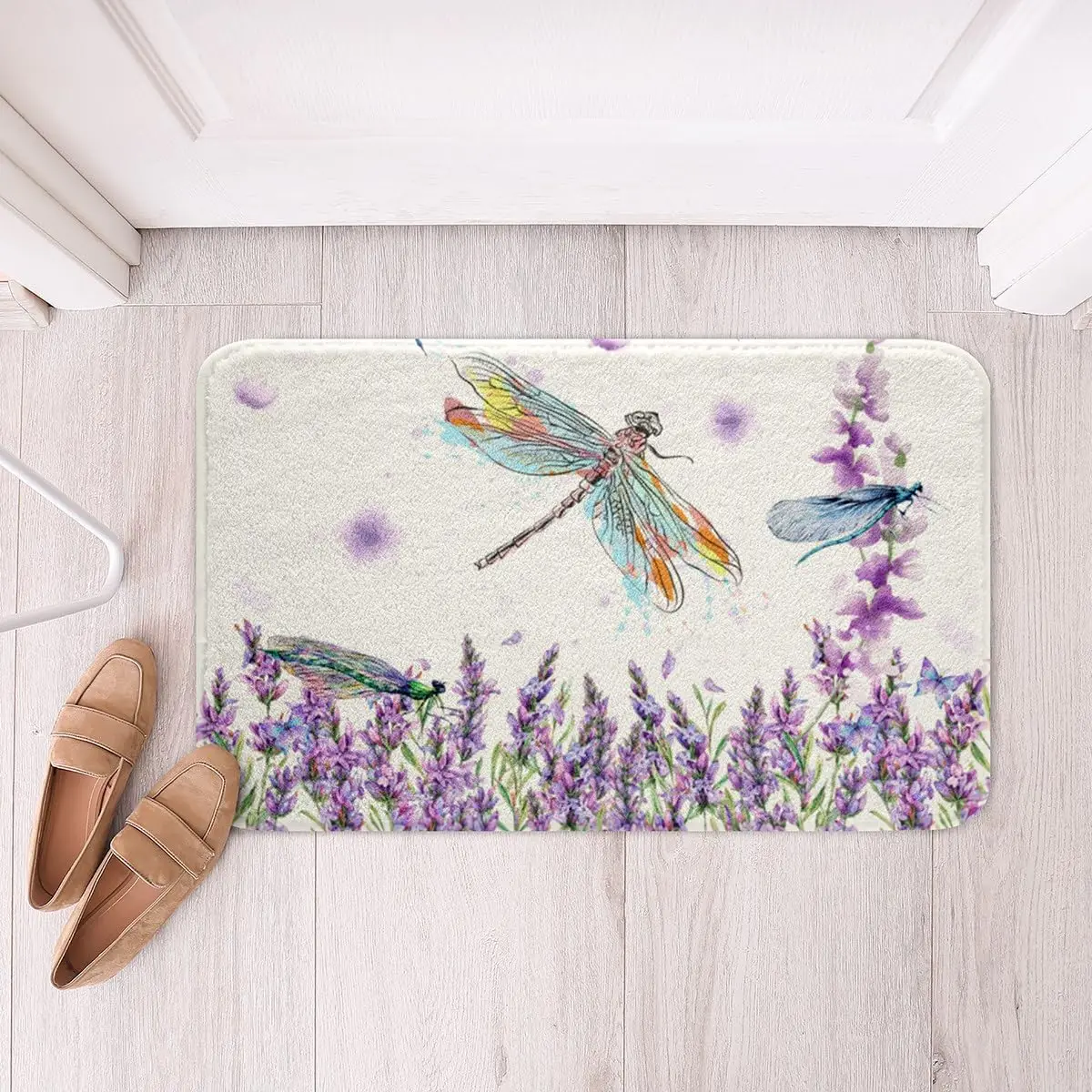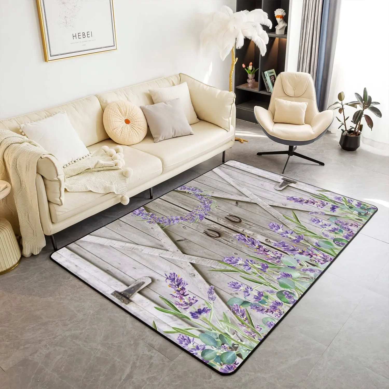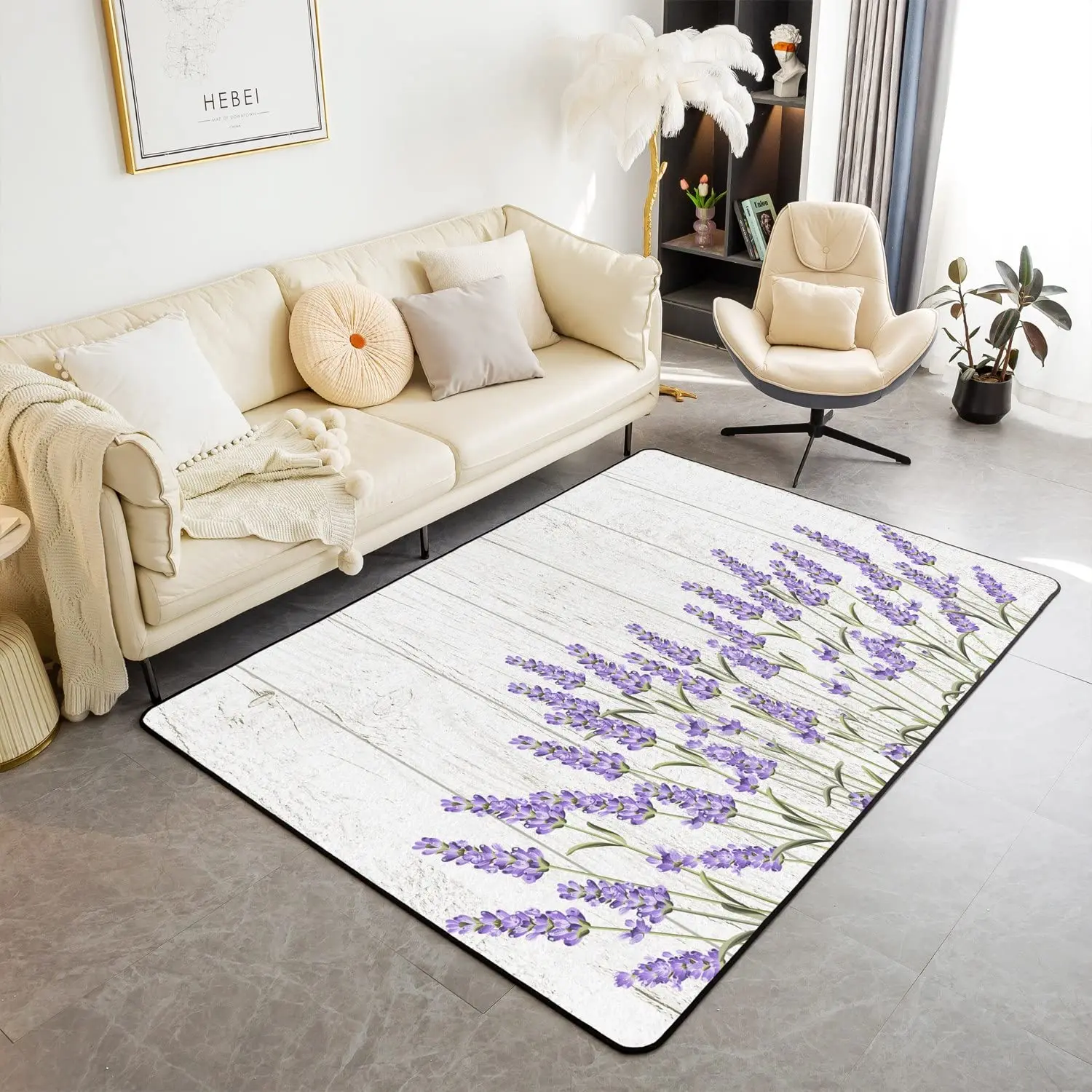 Purple Flowers Rug Watercolor Lavender Carpet Romantic Floral Doormat for Girls Teen,Wild Country Style Garden Flower Floor Mat