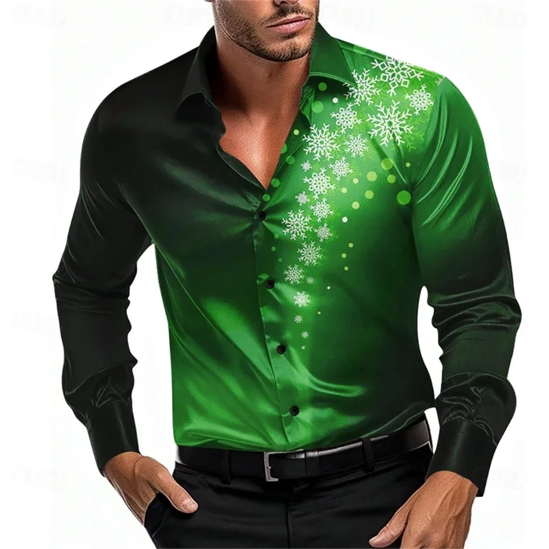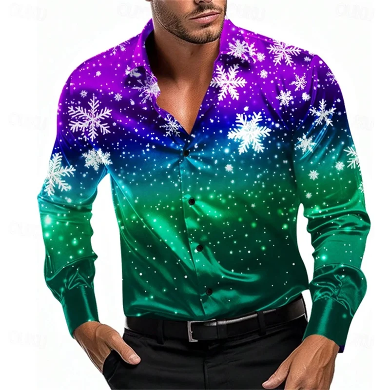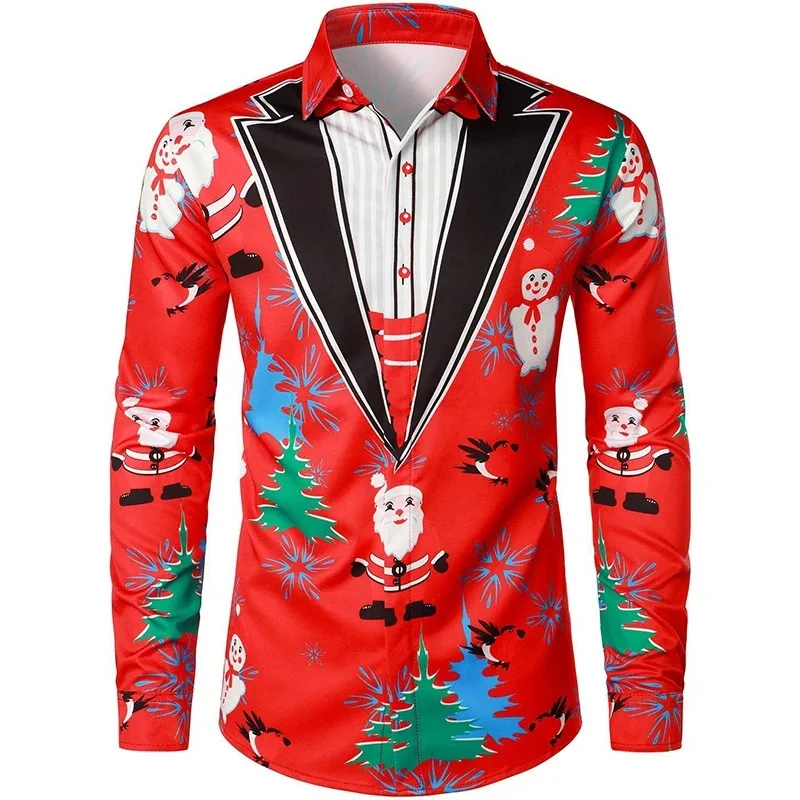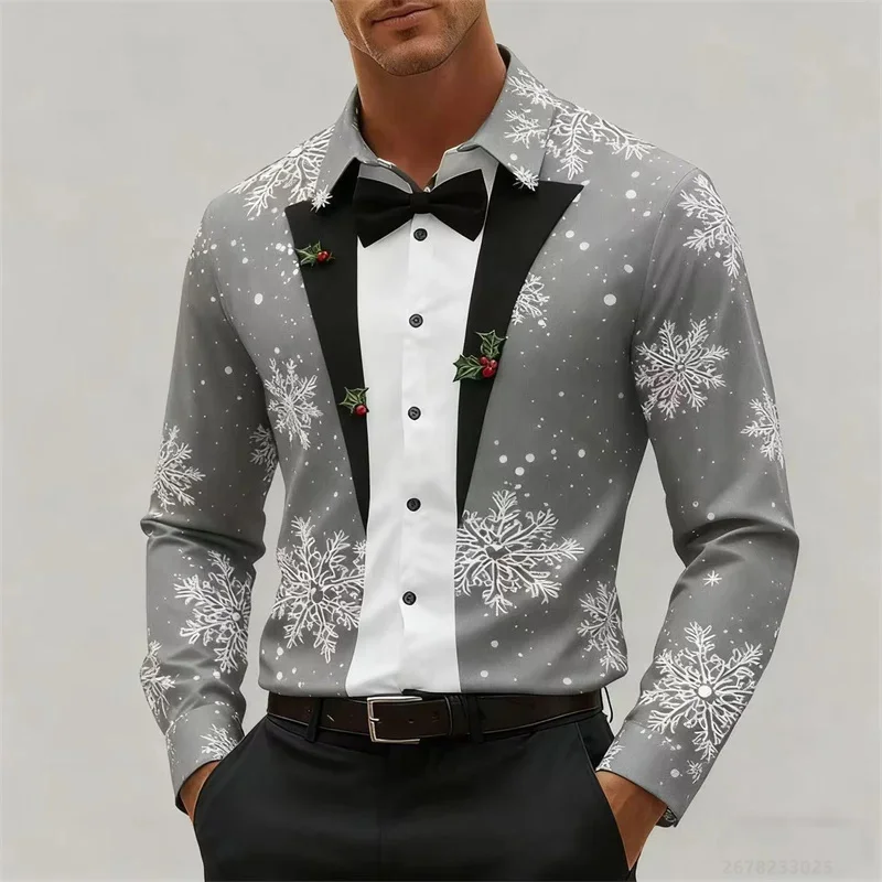 Men’s Christmas tree snowflake patterned shirt, tie printed dress, fashionable casual style, long sleeved lapel, trendy street s