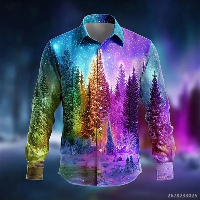 Men’s Christmas long-sleeved shirt, 3D high-definition printed Christmas tree pattern, lapel button men’s shirt, party wear