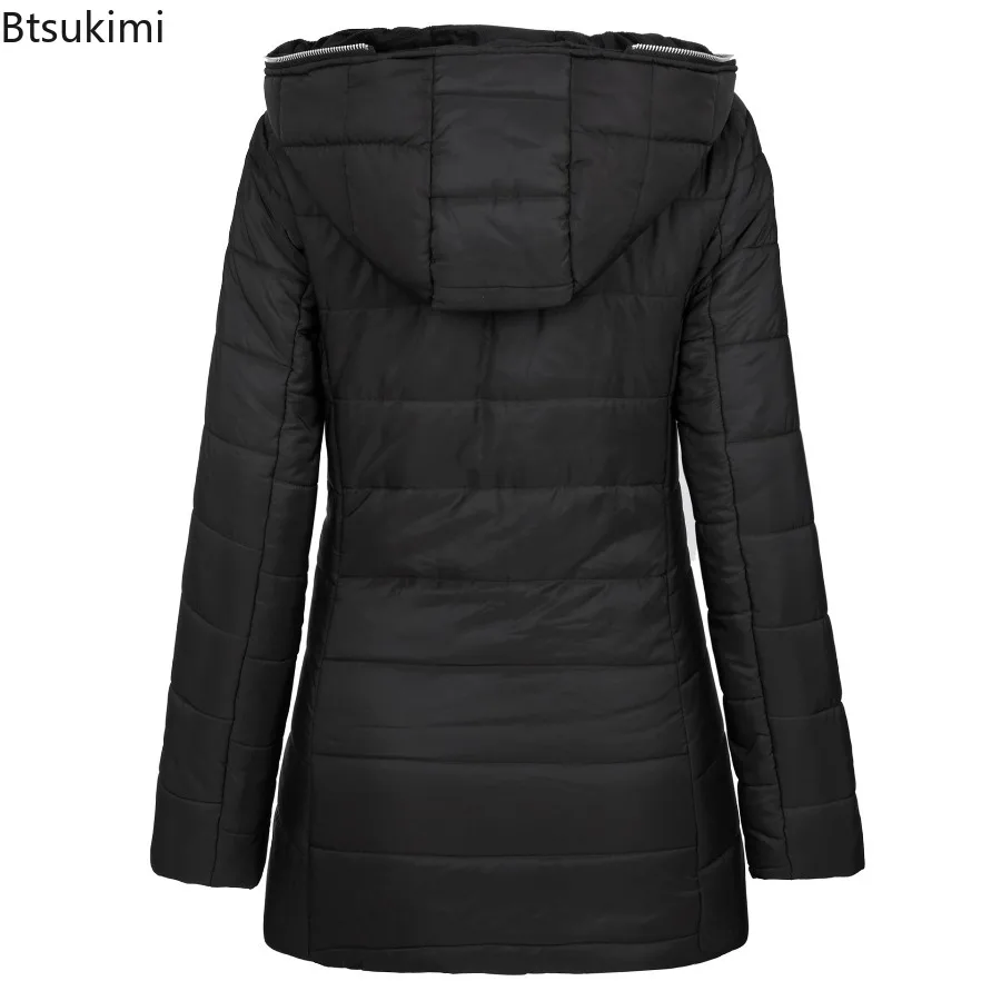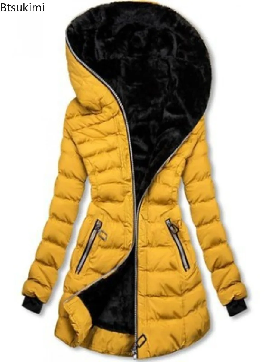 2025 Winter Women Parkas Hooded Solid Zipper Splice Midi Coats Long Sleeve Pockets Slim Fit Thick Coat Casual Warm Parka Jackets