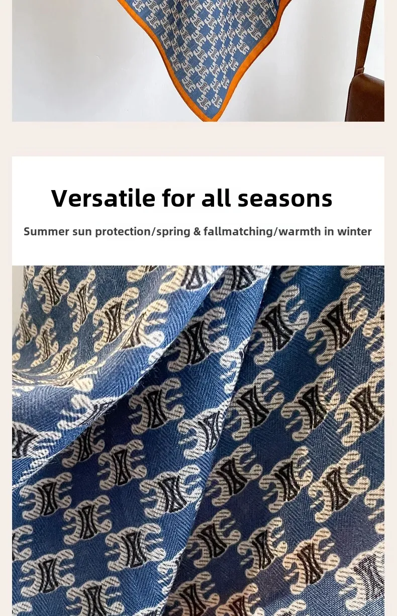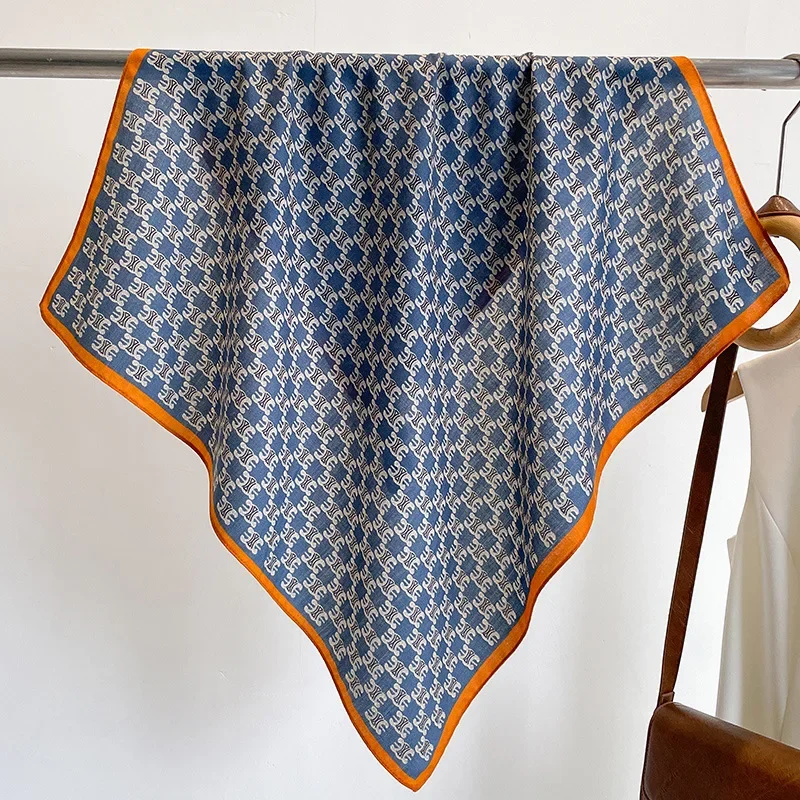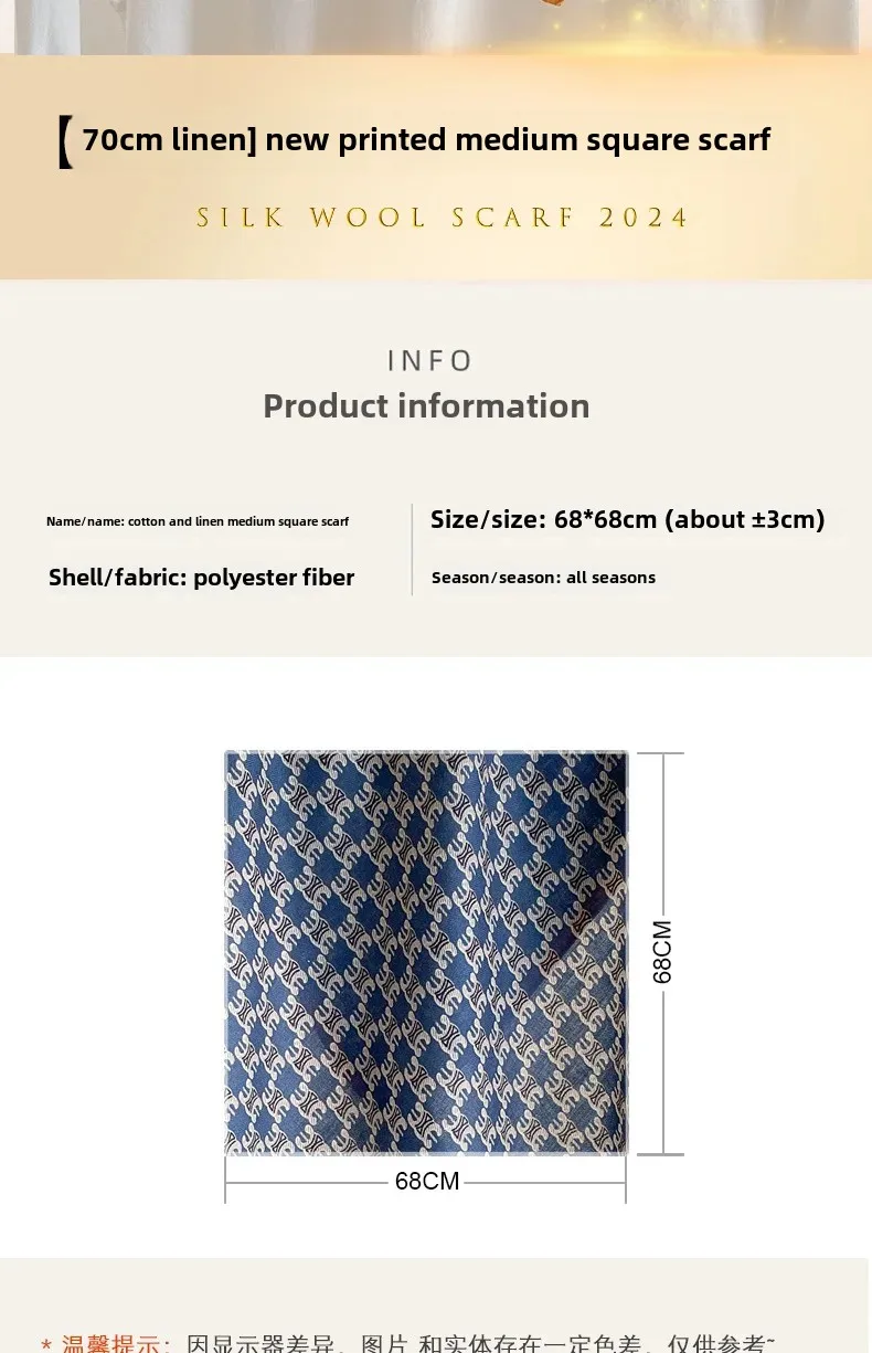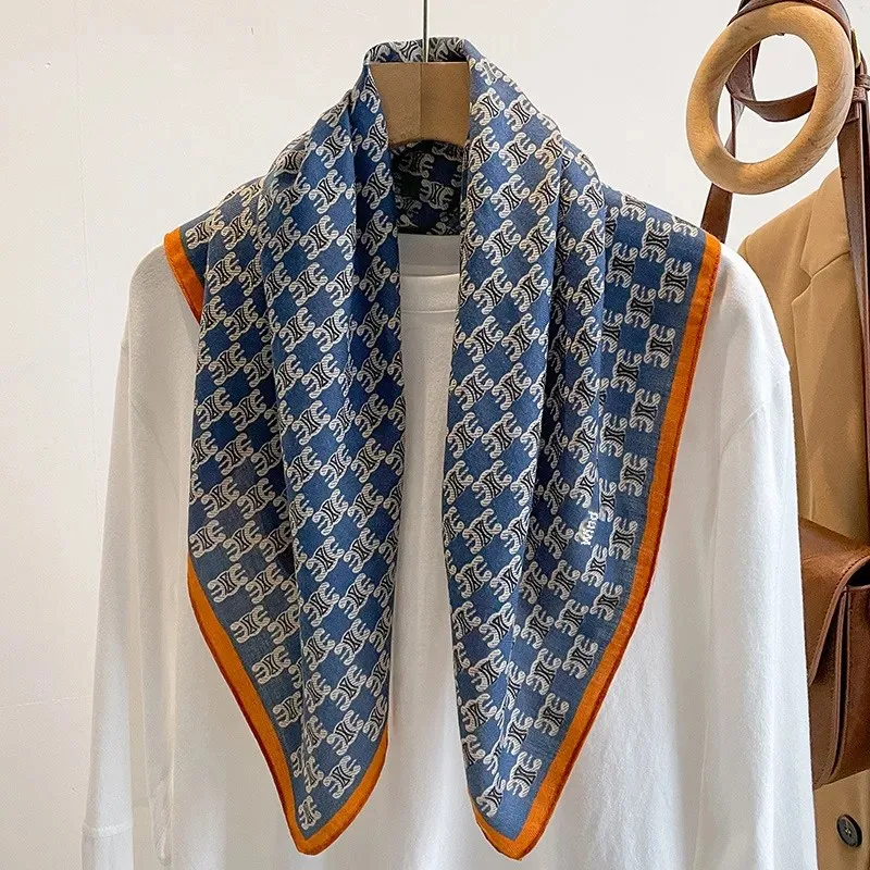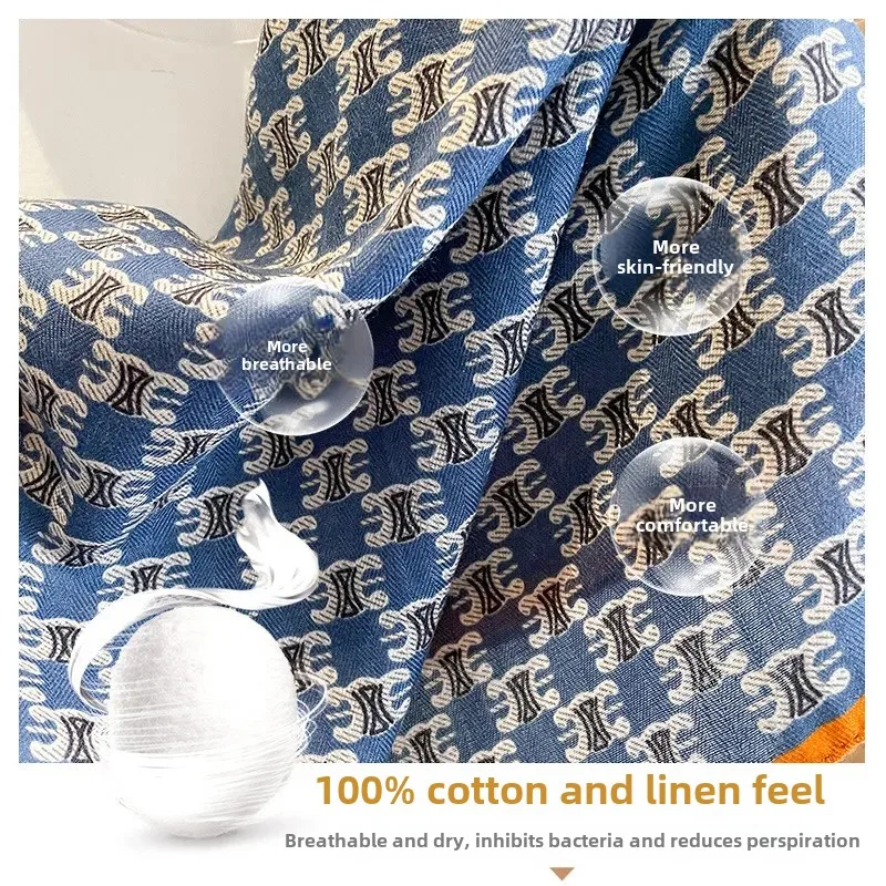 Blue Letter Printed Cotton Linen Square Scarf Women’s Spring Autumn Winter Small Tie Gift Shoulder Shawl for Mom Trendy Silk