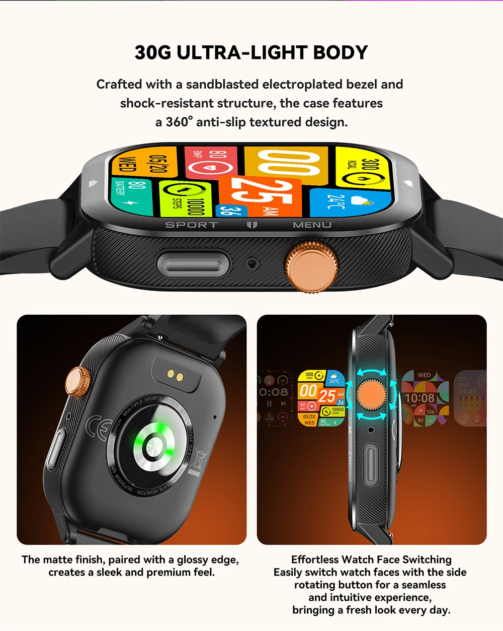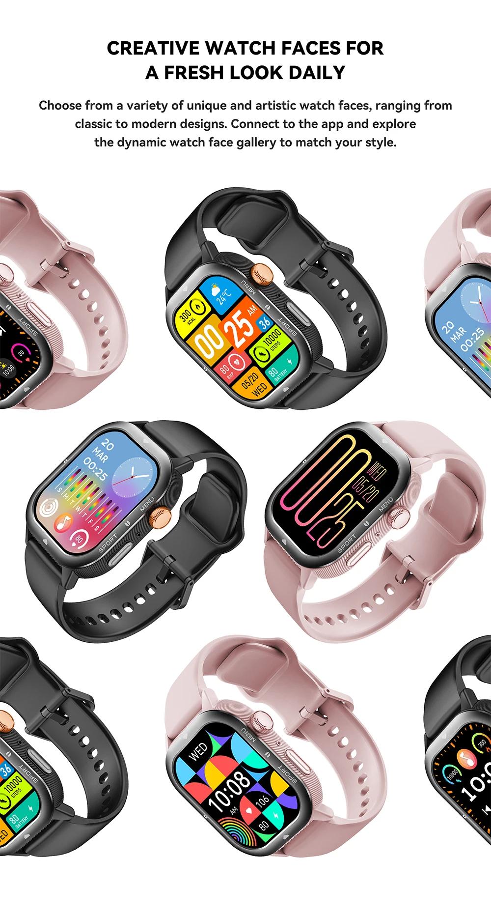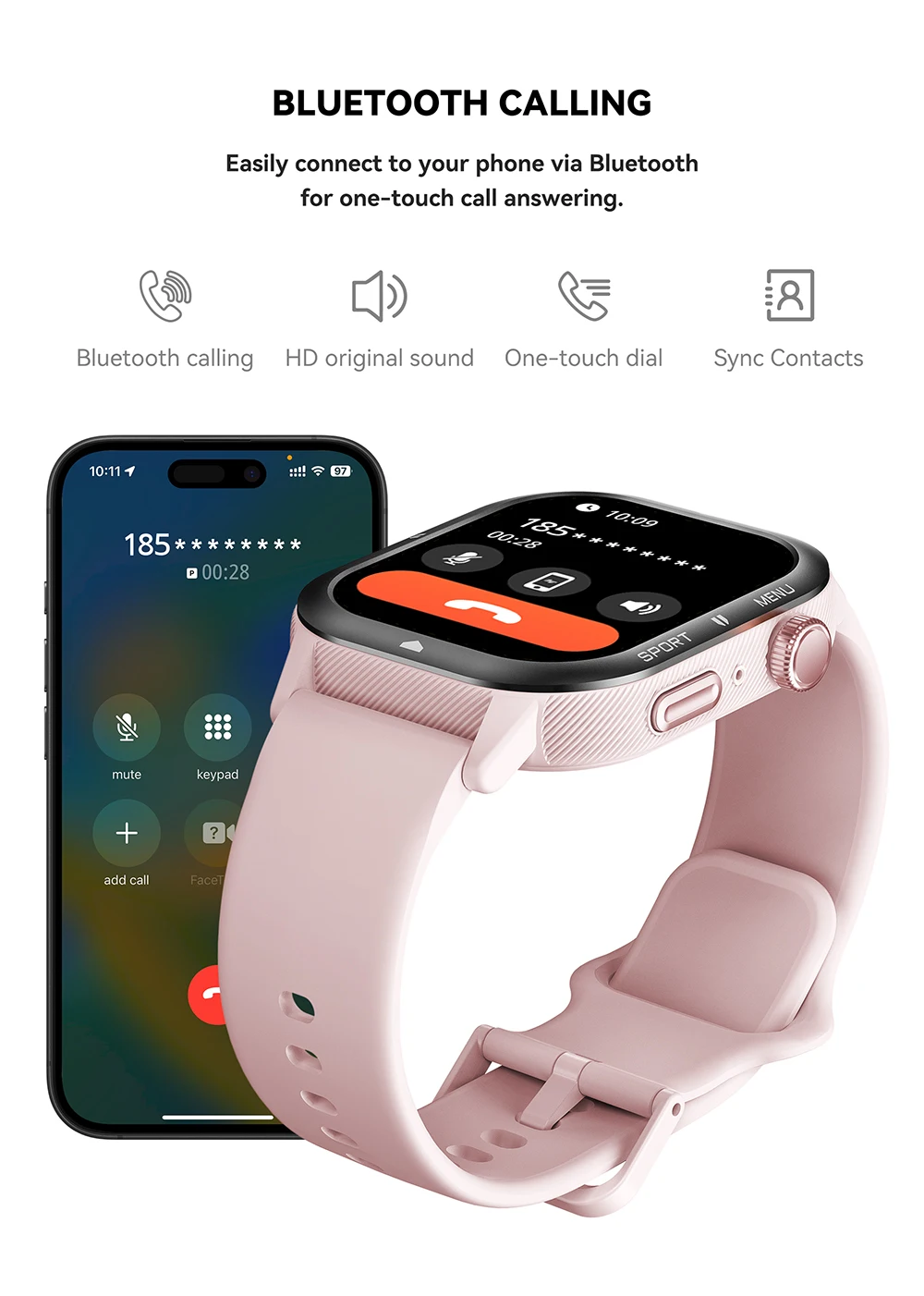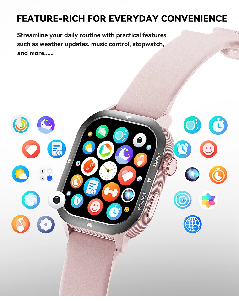 Data (pedometer, calorie, distance), sleep detection, heart rate detection, exercise mode (100+), exercise log, blood oxygen detection, stress detection, weather, bluetooth call (dialing, contacts, contacts, call history) Messages, Music Control, Breathing Training, World Clock, Voice Assistant, Timer, Alarm, Stopwatch, Women’s Health, Find Phone, Calculator, DND Mode, Power Saving Mode, Raise to Wake, Brightness Adjustment, Brightness Duration, AOD. Sound & Vibrate, Dial Switch, Menu Style, Time Setting, Cover lock, Off Wrist Lock, Password, SOS Emergency Call, System (Restart, power off, Reset)