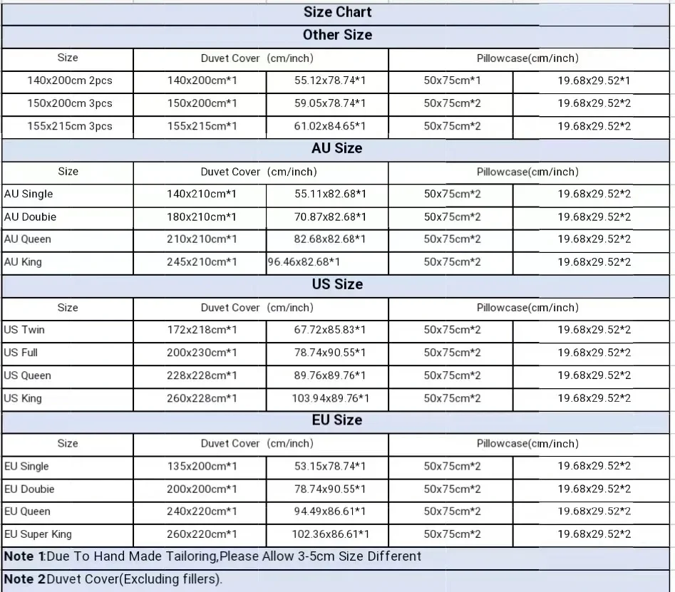 The default pillowcase size is 75 * 50cm. If you need other sizes, please leave a note when purchasing and we can replace them for free.