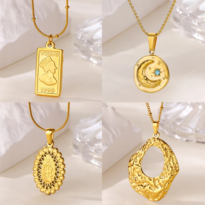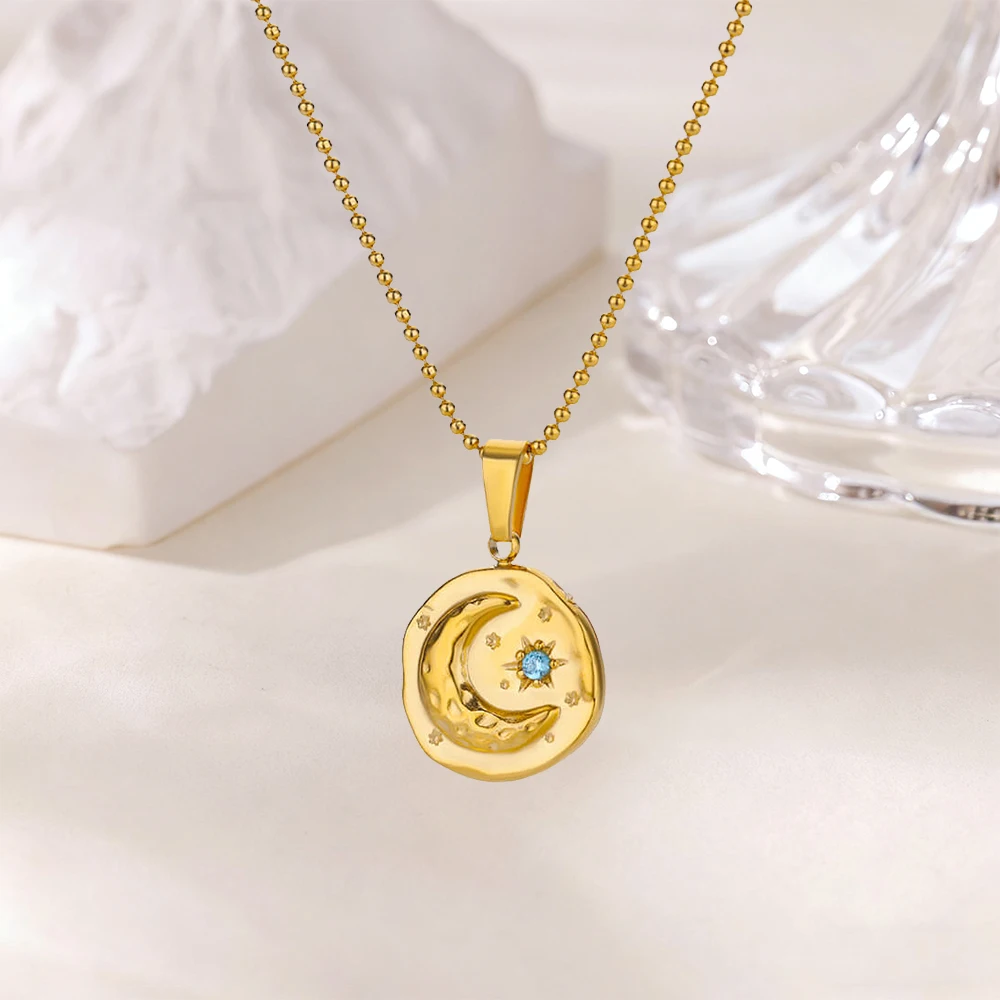 Geometric Portrait Necklaces for Women 18K Gold Plated Stainless Steel Crescent Moon Necklace Fashion Waterproof Jewelry