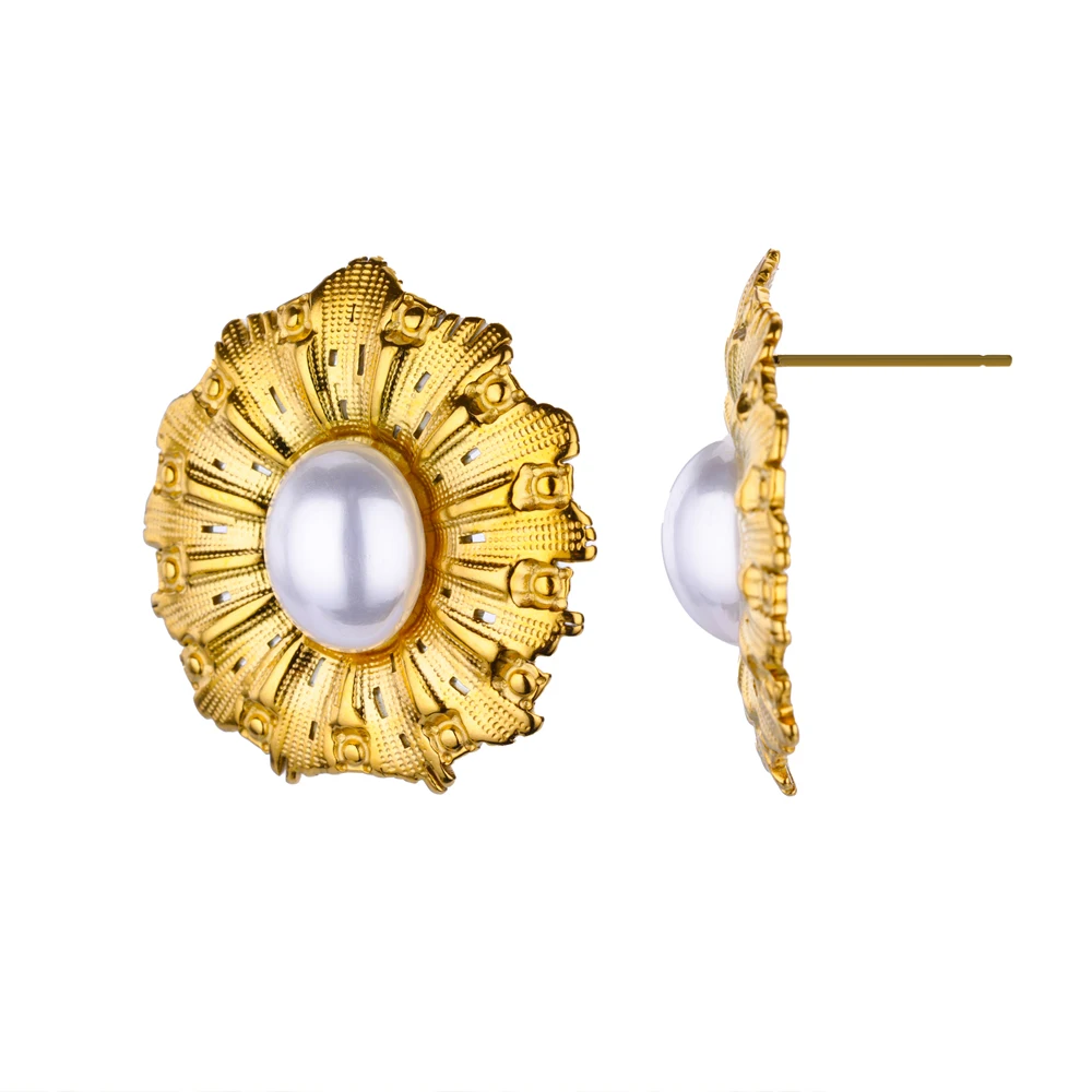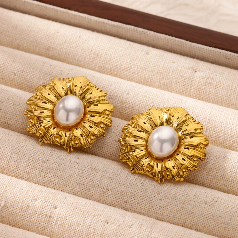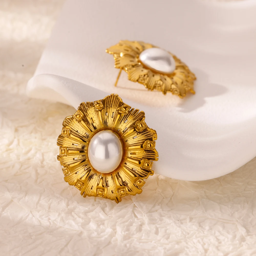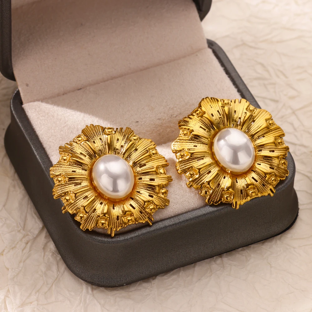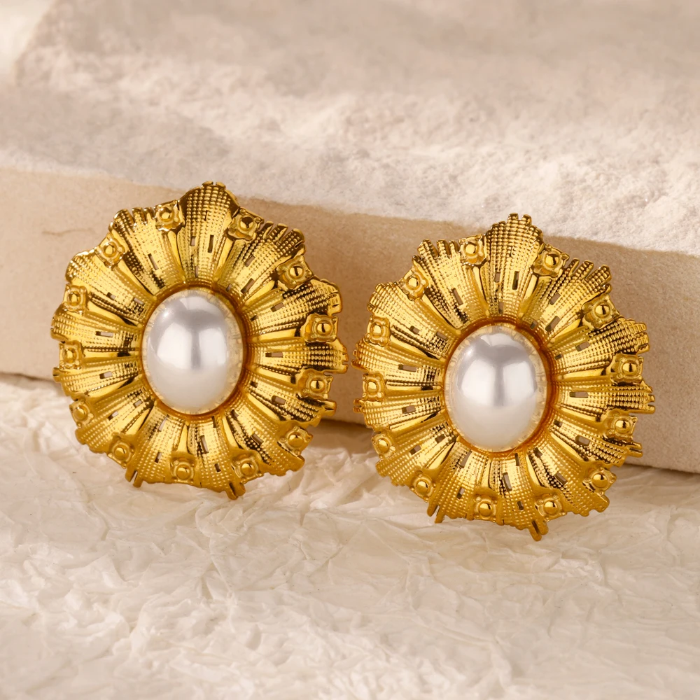 Gold Color Sun Flower Earrings for Women Stainless Steel Imitation Pearl Stud Earrings 2025 Trend Piercing Wedding Jewelry Gift