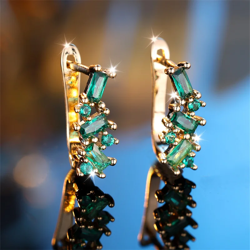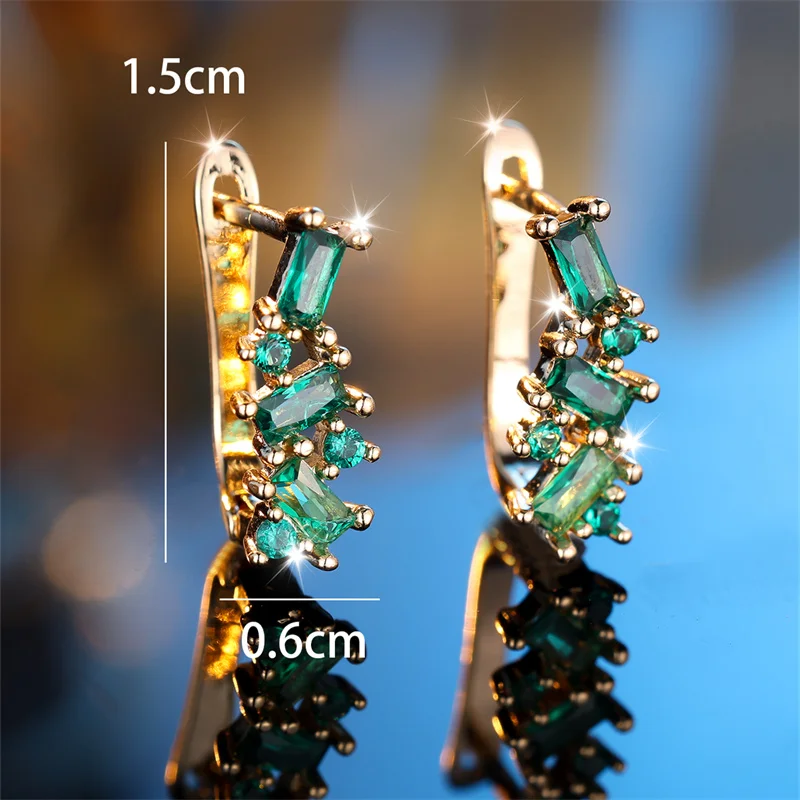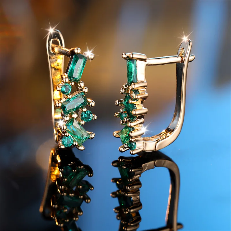 Irregular Small Rectangle Round Green Stone U Shaped Hoop Earrings For Women Antique Gold Color Small Ear Buckle Party Jewelry