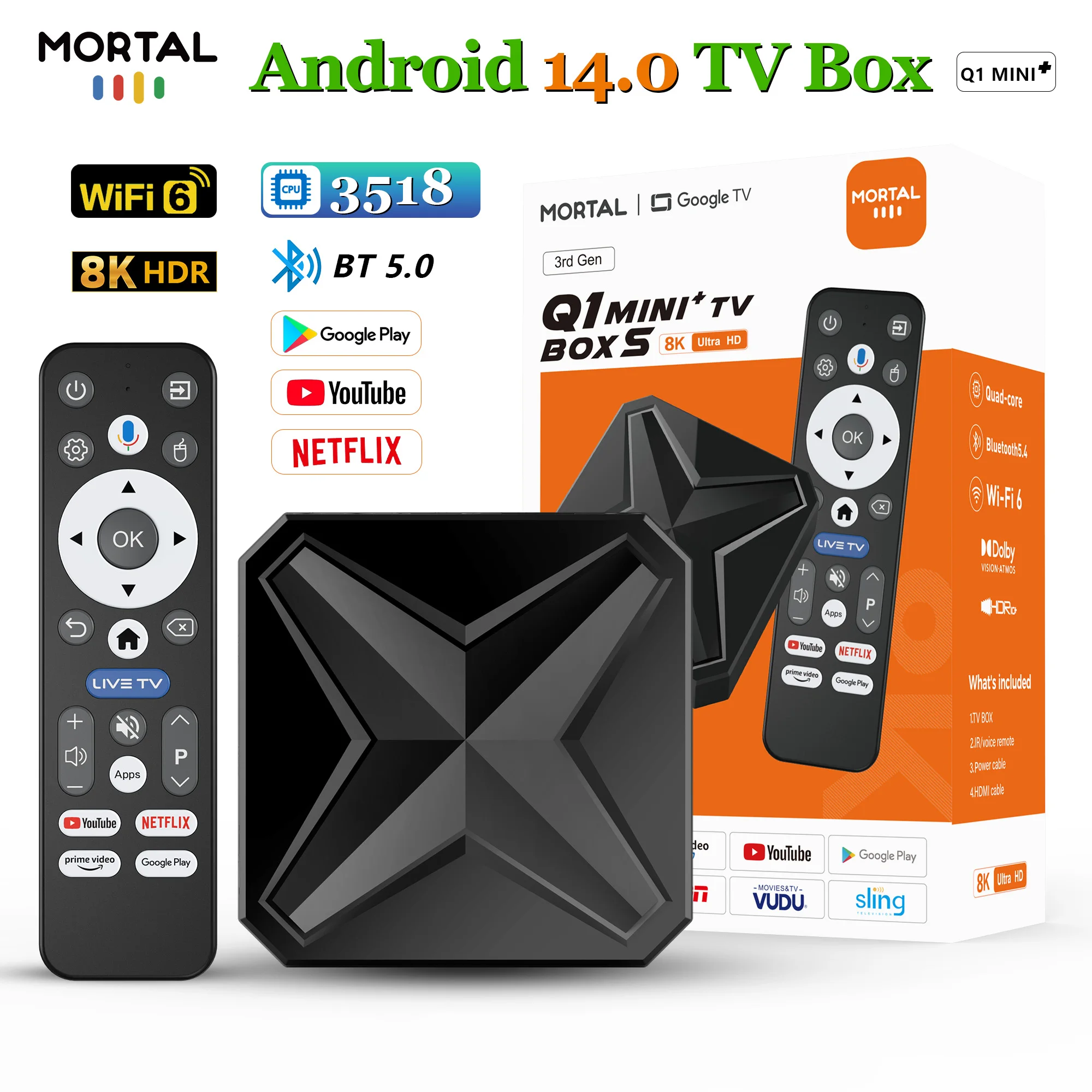 Mortal RK3518 Rockchip Smart TV Box BT5.0+ Android 14.0 ROM 16GB RAM 2GB Wifi6 4K Voice Assistant Media Player TV Box Q1 MINI+