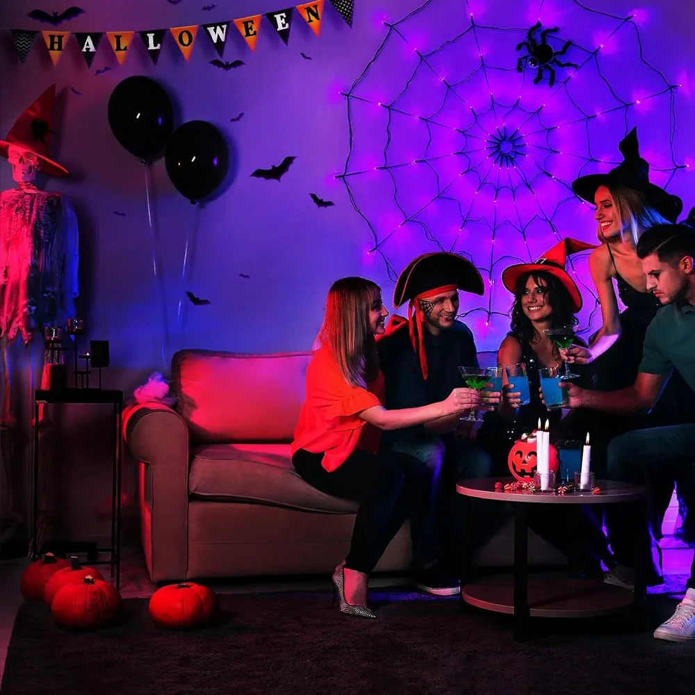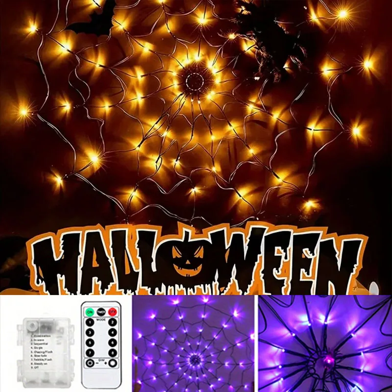 Outdoor Halloween Spider Web LED Purple Lights Battery Powered 8 Modes 70LED String Lights Remote Control Garden Wall Decoration