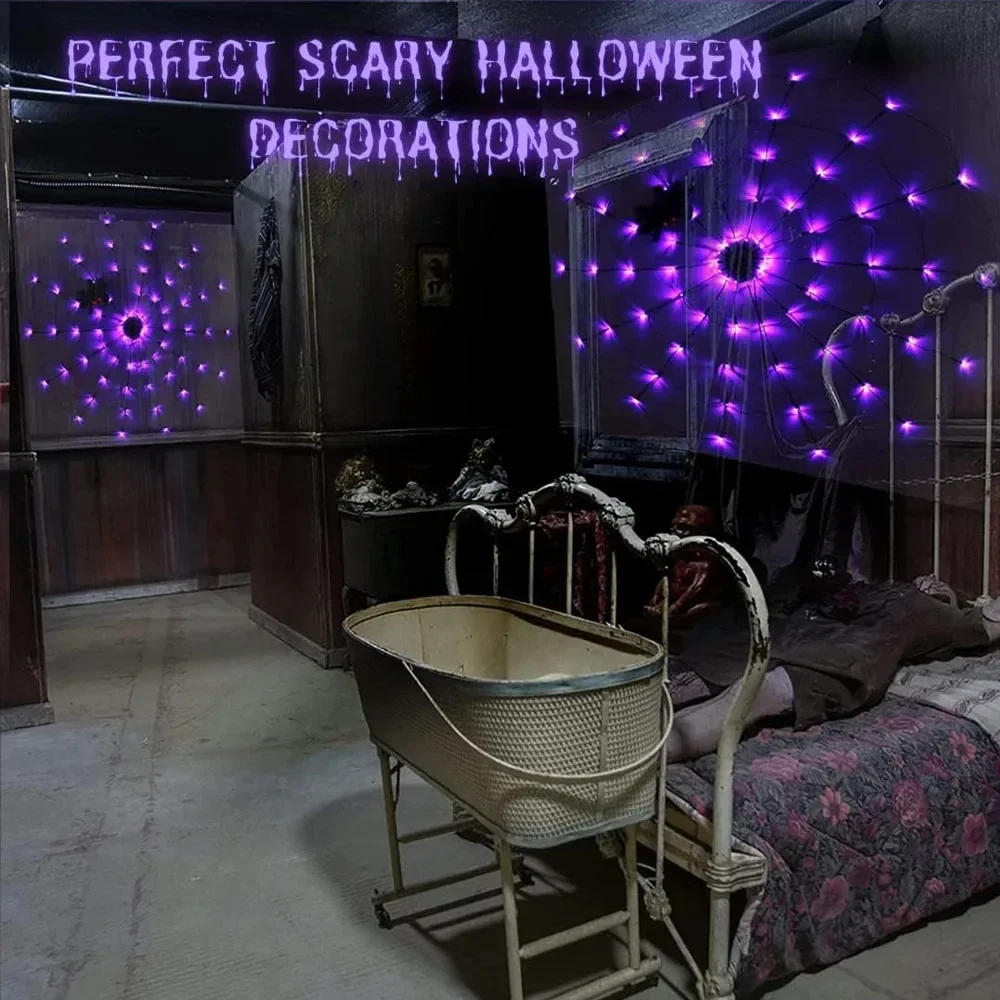3.【Super Bright Web Light】:Spider web lights adopts LED high-brightness lamp bead, bright, energy-saving, waterproof and durablecan hang it in walls, yard, hedges and fences, Very suitable for Halloween theme parties, masquerade and masquerade parties, bars and horror houses.