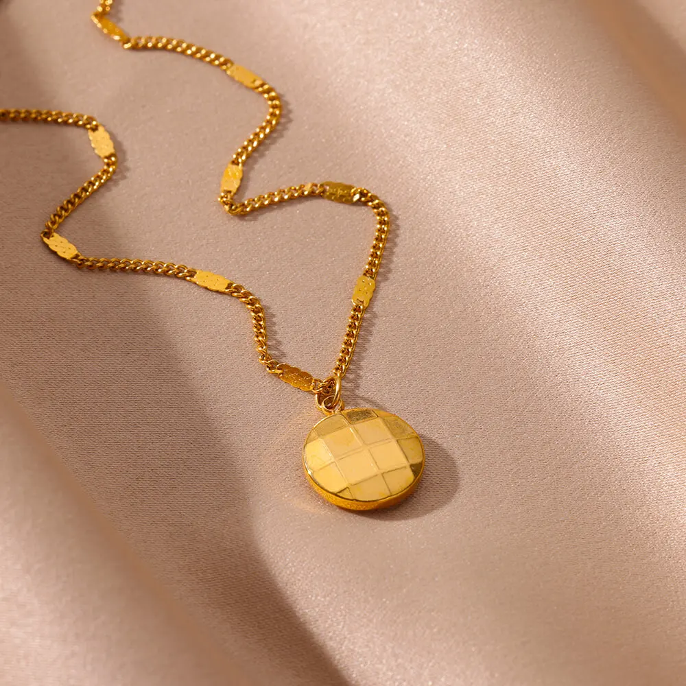 Plaid Texture Round Button Necklace for Women Gold Color Stainless Steel Chain Necklaces Fashion Wedding Party Jewelry Gift