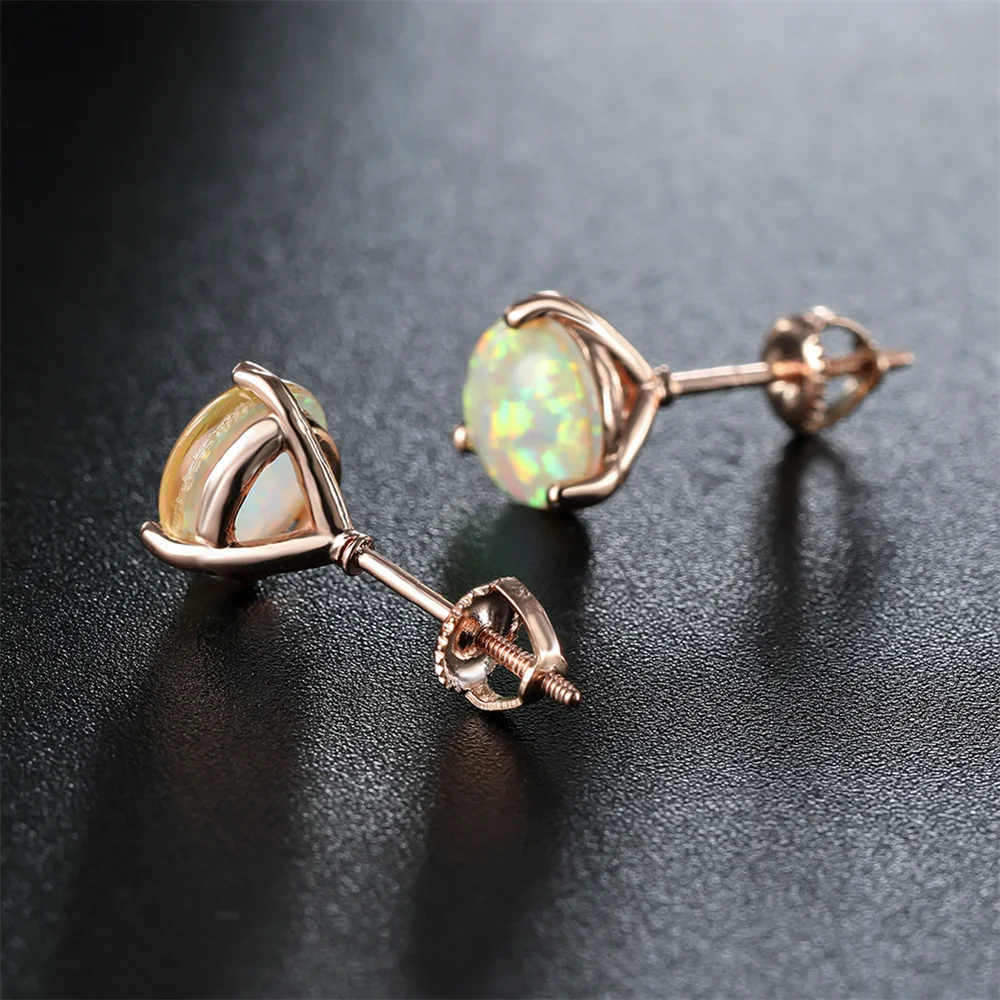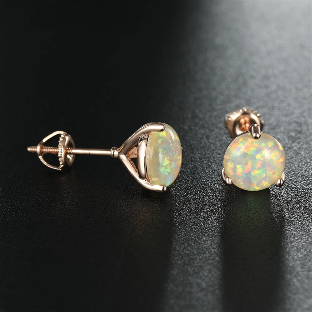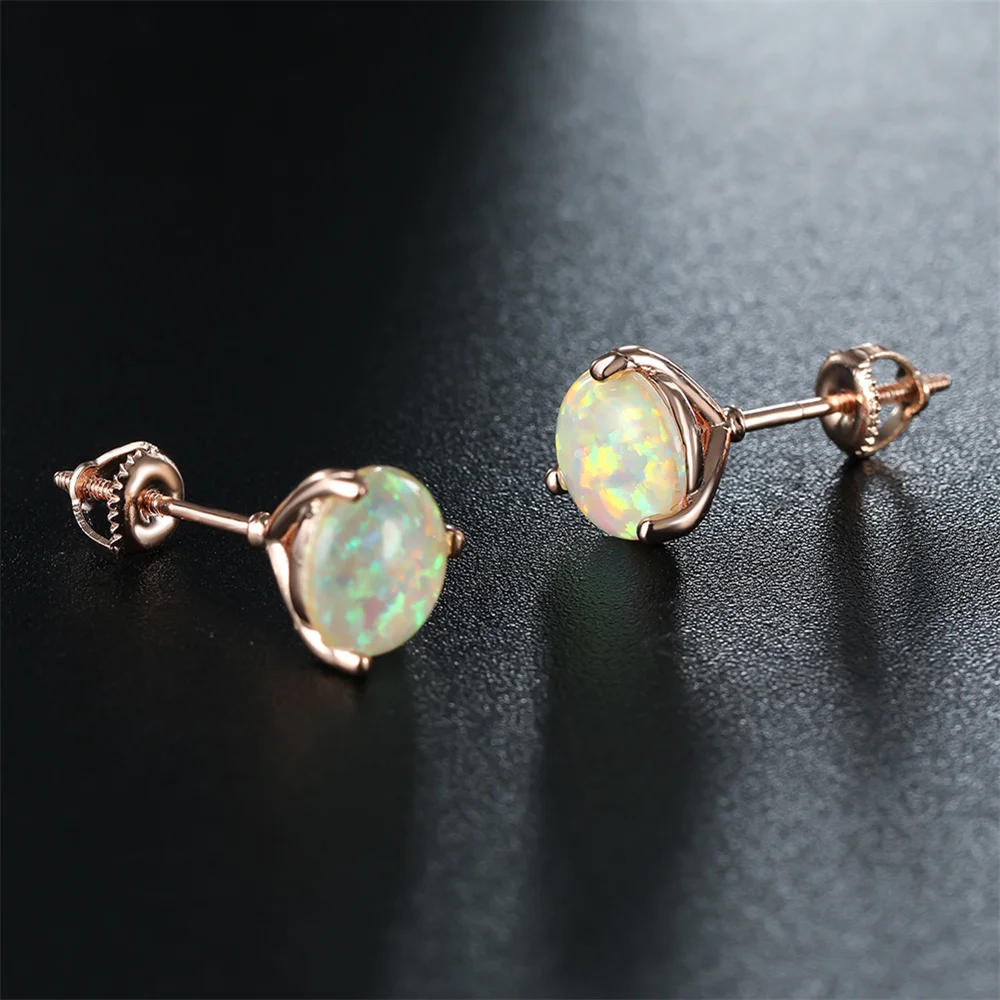 White Fire Opal Small Round Stone Earring Female Simple Trendy Screw Back Stud Earrings For Women Rose Gold Color Bridal Jewelry