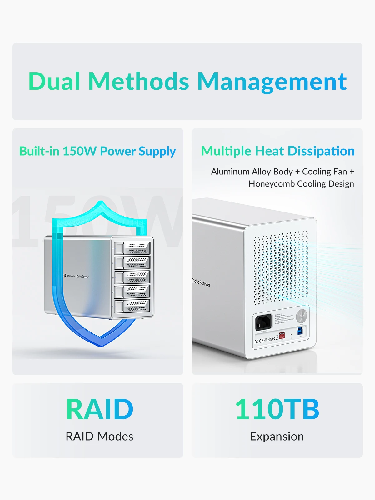 The Strong Power Supply Can Provide Output in 150W Rated Power, Which Can Ensure Stable Operation Of Hard Drives When You Insert Five 22TB HDDs Into The Enclosure.
