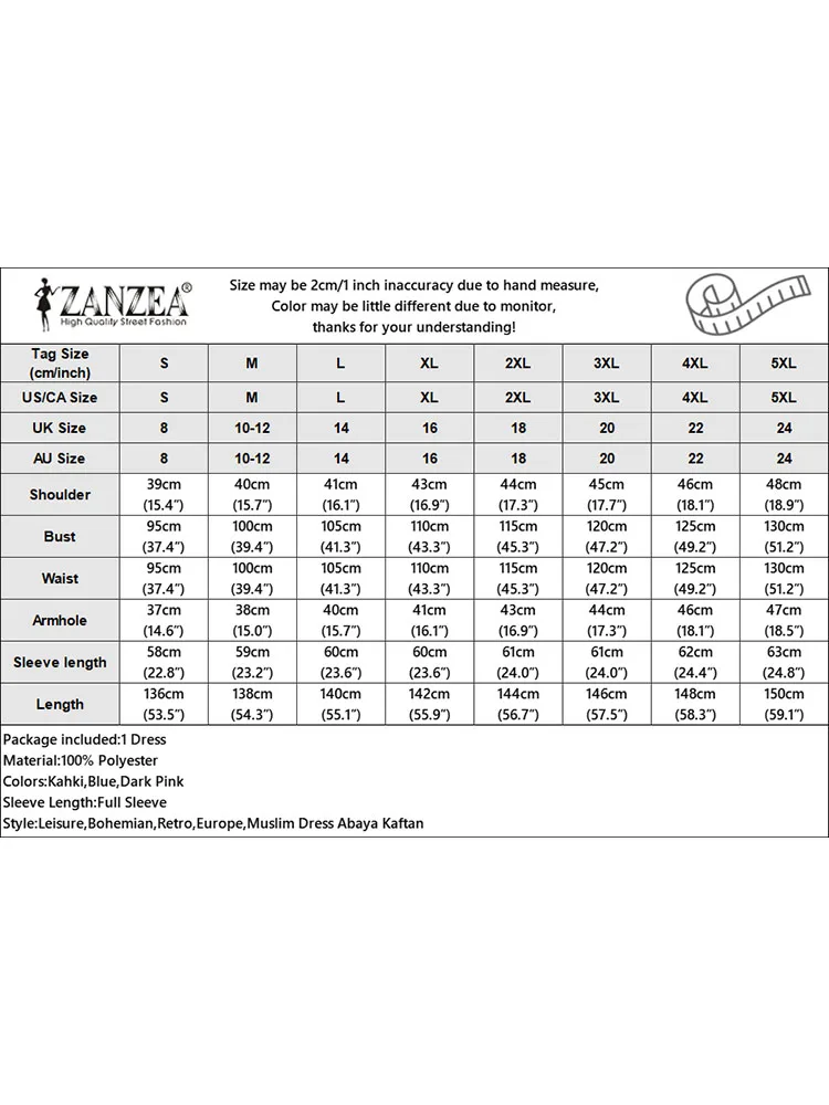 | Package included:1 Dress Material:100% Polyester Colors:Kahki,Blue,Dark Pink Sleeve Length:Full Sleeve Neckline:O-Neck Pattern:Printing Length:Ankle Length Buckle chain:Button Down Front Thickness:Thin Style:Leisure,Bohemian,Retro,Europe,Muslim Dress Abaya Kaftan Season:Spring,Summer,Autumn,Winter Occasion:Family,Party,Beach,Wedding,Holiday,Employment Label: Yes Attentions: 1.The Real Object May Exist Slightly Colors Differences Compared To Images As Different Computers Display.Caution If Minding,Thanks. 2.There Might Be A Manual Measuring 1-3 cm Error.Sorry For Any Inconvenience. 3.Please Prevail On Real Item, Model Images For Reference Only. 4.Attention!!!Please check the size chart carefully before placing the order.