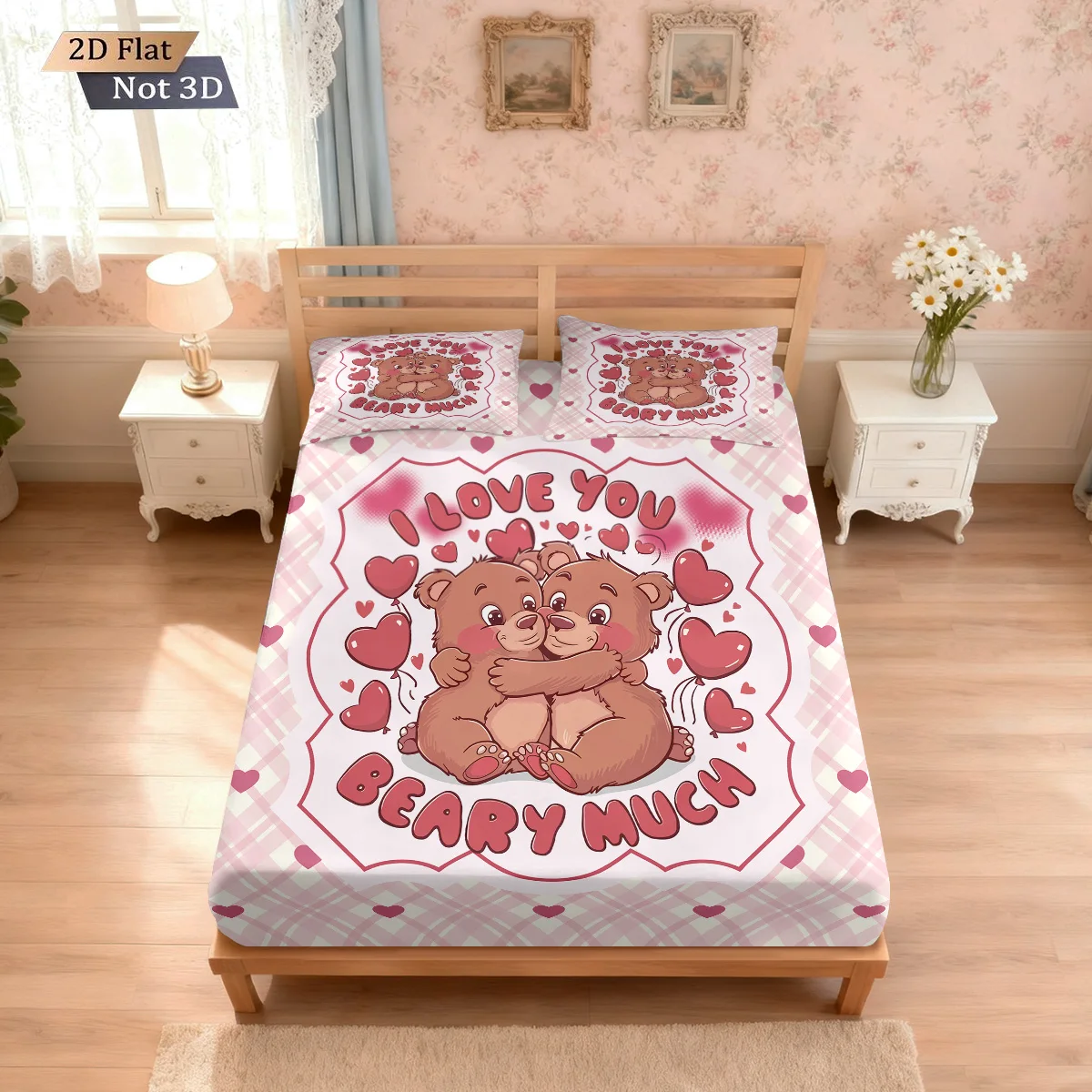 3pcs Valentine’s Day Pink Bear Print Coreless Bed Sheet Set Multi Size Soft Bedcover Bedroom Bedding Decoration Machine Washable