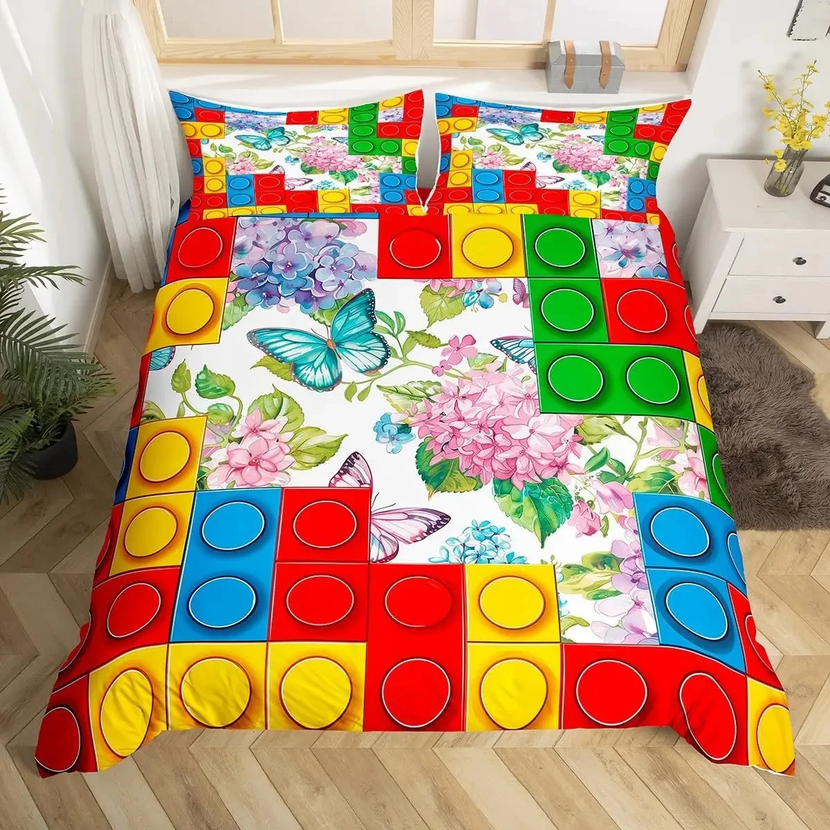 Construction Bedding Set Colorful Polyester Comforter Cover 3D Building Blocks Duvet Cover Kids Boys Rainbow Bricks Quilt Cover