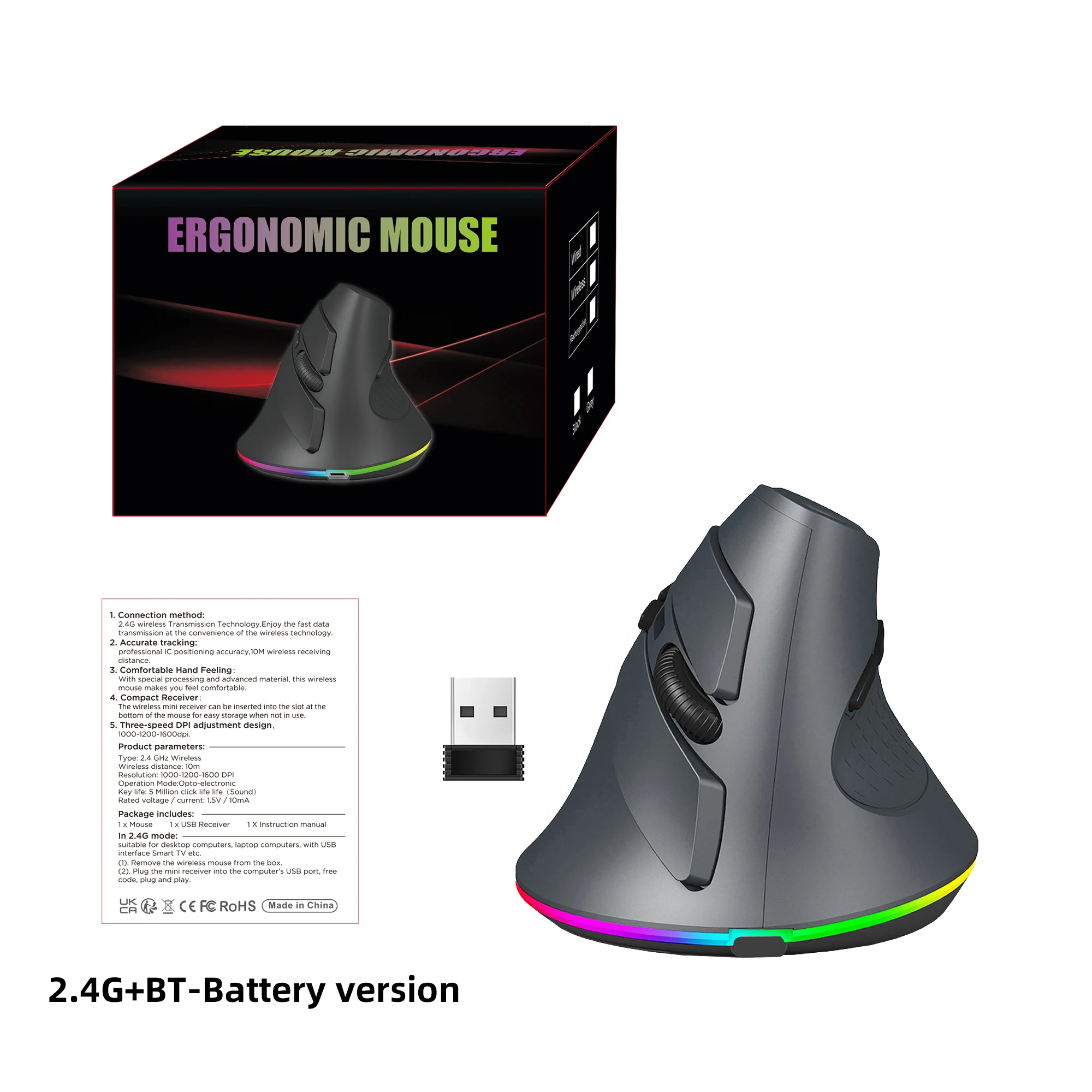 Dual Modes Wireless Mouse 2.4G USB Bluetooth 5.1 LED Battery Ergonomics Vertical Mouse With Backlight For Tablet PC Laptop