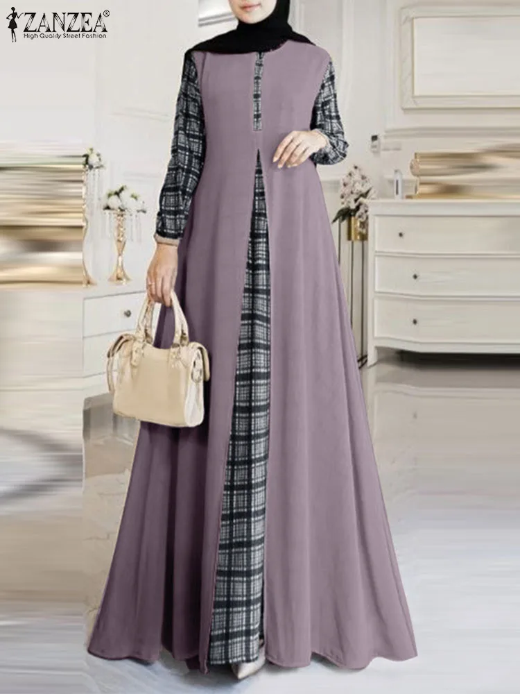 Elegant Muslim Abaya Dress ZANZEA Women Long Sleeve Patchwork Maxi Sundress IsIamic Robe Spring Checked Vestidos Kaftan Ramadan