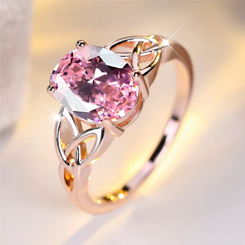 Elegant Pink Crystal Big Oval Stone Rings For Women Vintage Hollow Rose Gold Color Wedding Band Bridal Jewelry Engagement Gifts