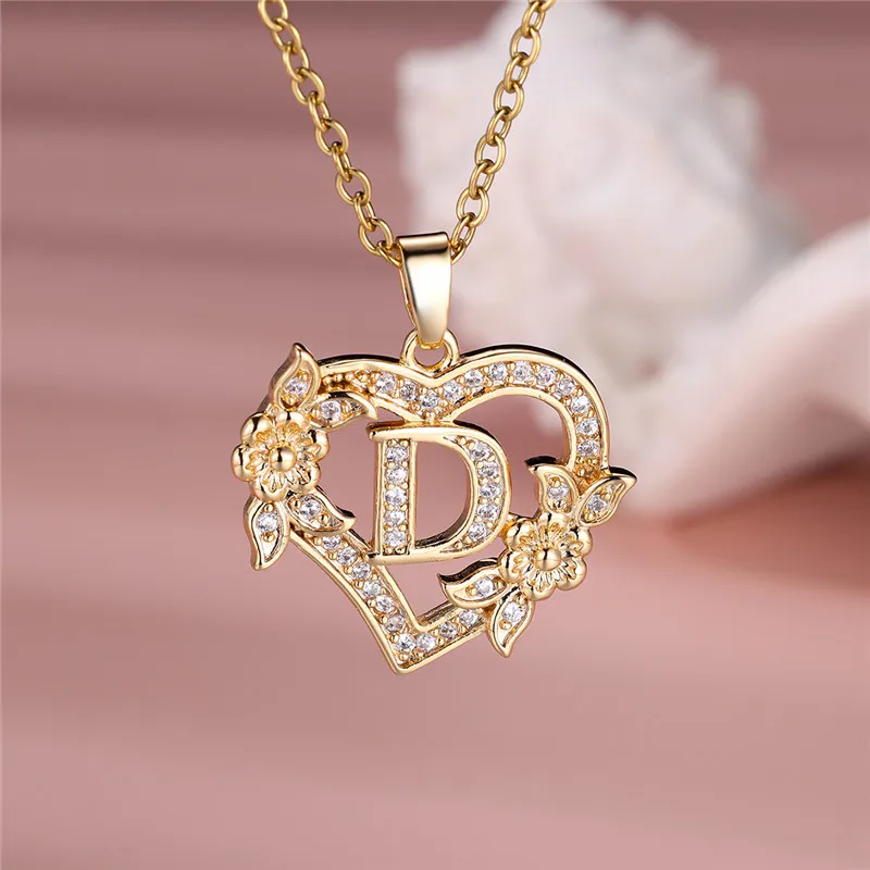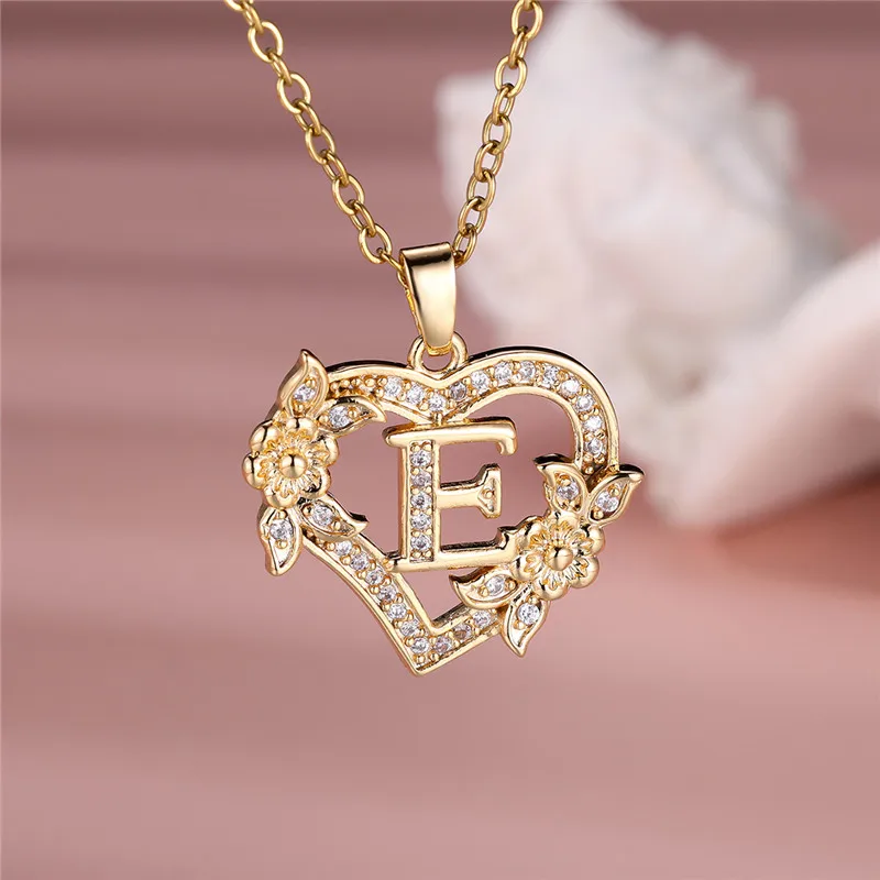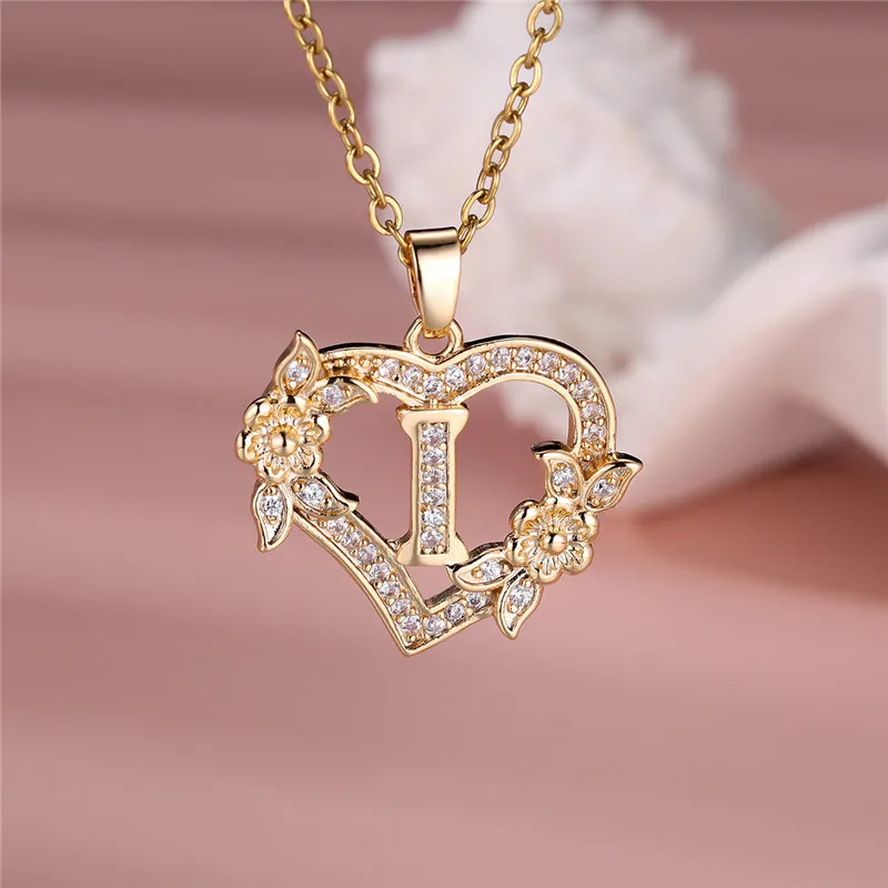 Female A-Z 26 Letters Flower Heart Pendant Necklace Vintage Gold Color Chains Necklaces Wedding Jewelry Gift For Women