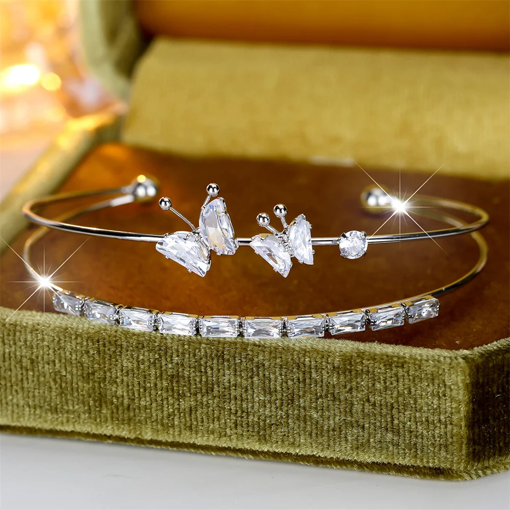 Female Cute Small Butterfly Double Layer Opening Bangle Bracelets For Women Charm Gold Silver Color White Zircon Wedding Jewelry
