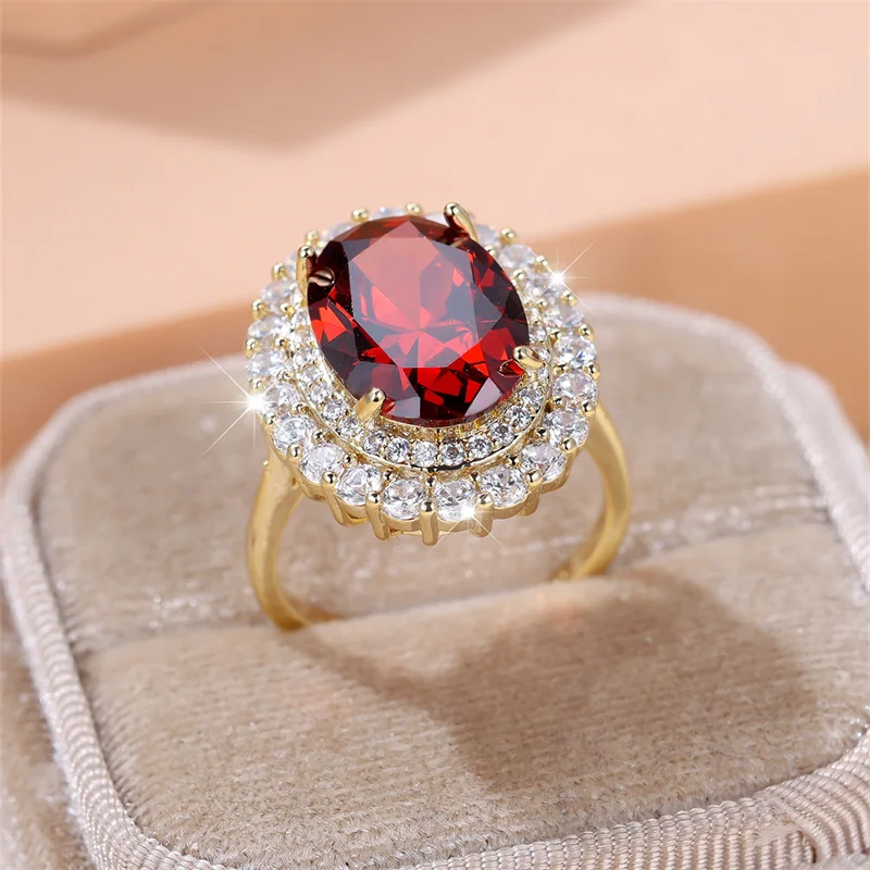 Female Cute Red Zircon Big Oval Stone Ring Gold Color Engagement Charm Wedding Jewelry For Women