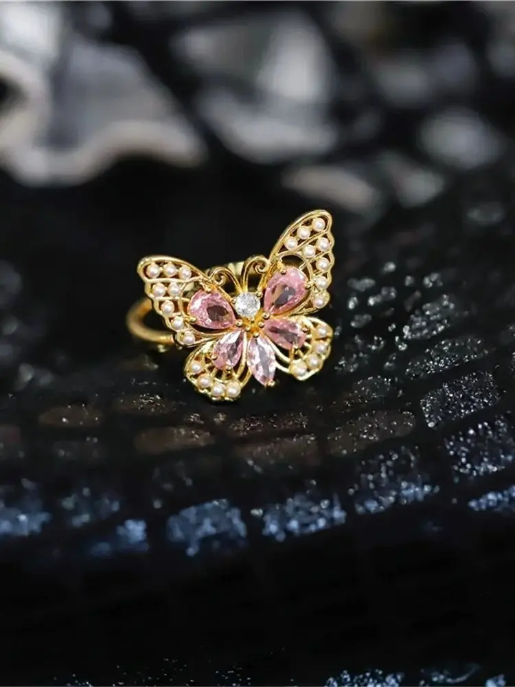 Female Cute White Pink Zircon Stone Gold Color Wedding Rings Promise Open Butterfly Adjustable Engagement Jewelry For Women