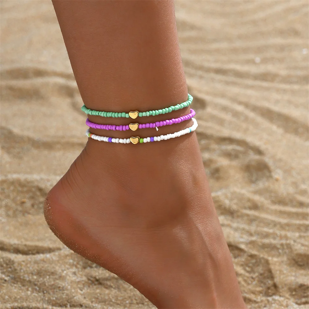 Gold Color Love Heart Foot Chains Simple Fashion Rainbow Beads Anklets For Women Ankle Bracelet Beach Jewelry Summer Accessories