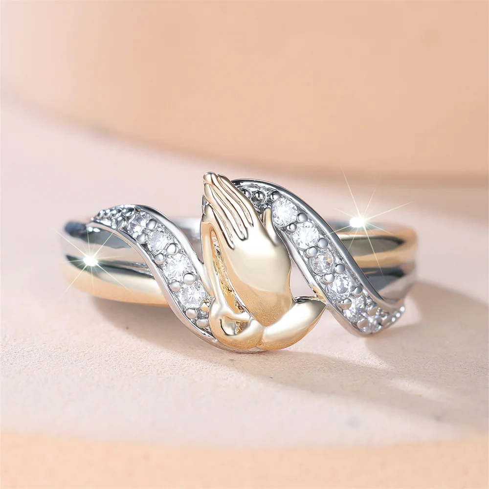 Gold Color Hands Prayer White Zircon Rings For Women Vintage Silver Color Engagement Ring Wedding Jewelry Bridal Versatile Gifts