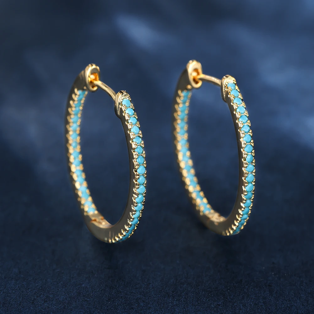 Hiphop Blue Turquoise Stone Round Thin Circle Hoop Earrings For Women Gold Color Unisex Female Male Punk Wedding Hoops Jewelry