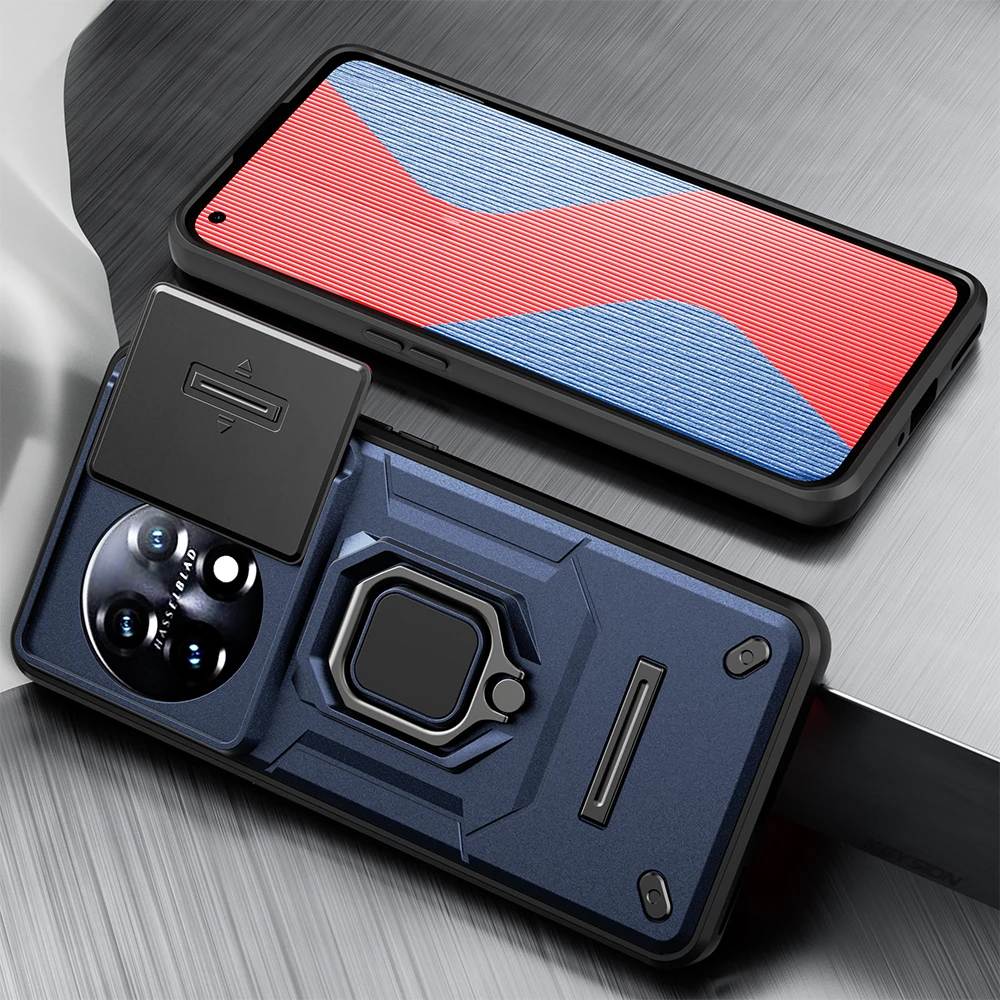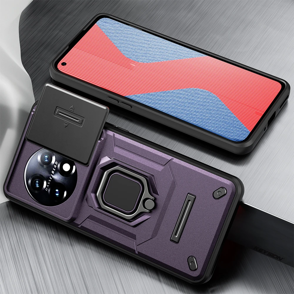 KEYSION Shockproof Armor Case for Oneplus 11 5G 11R Slide Camera Lens Protection Ring Stand Phone Back Cover for OnePlus 1+Ace 2