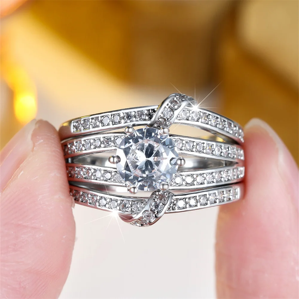 Shining White Zircon Round Stone Rings Sets For Women Vintage Silver Color Engagement Ring Wedding Jewelry Bridal Versatile Gift