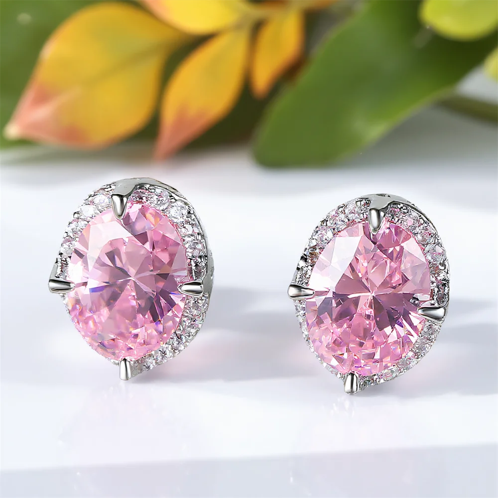 Small Oval Stone Elegant Pink Crystal Stud Earrings For Women Vintage Silver Color Wedding Earring Versatile Jewelry Gifts