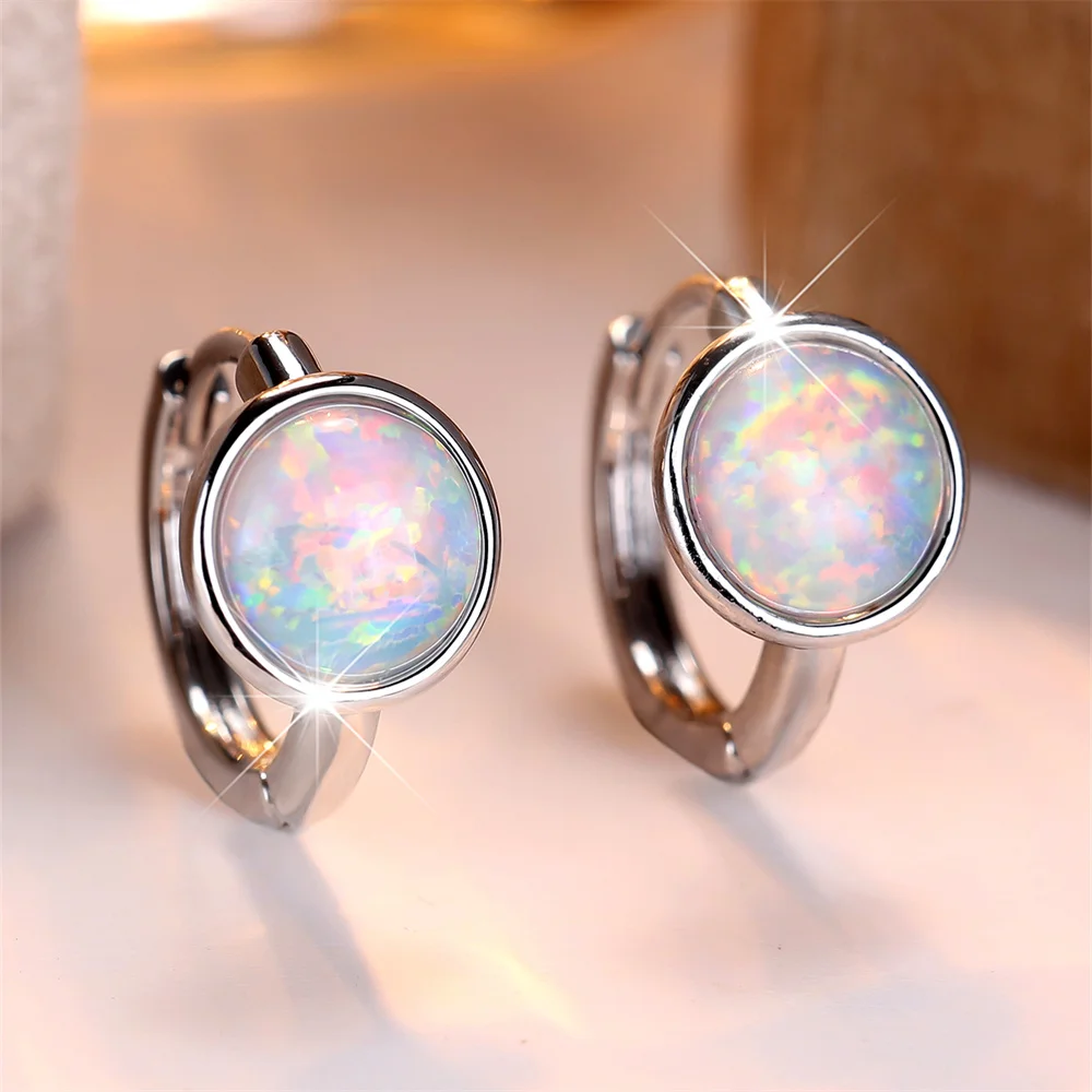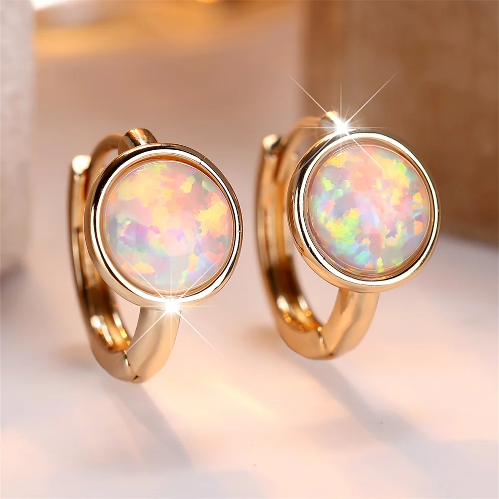 Small Round Stone White Fire Opal Hoop Earrings For Women Vintage Gold Silver Color Ear Buckle Wedding Jewelry Versatile Gifts