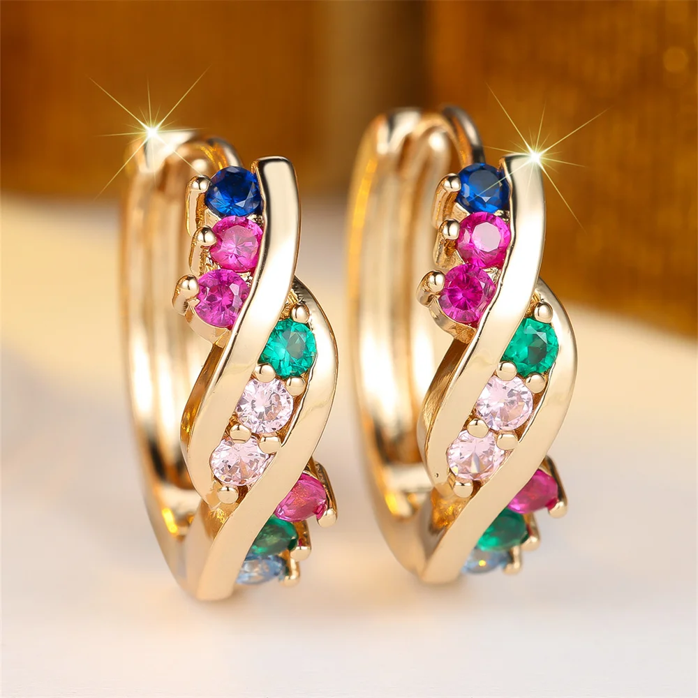 Small Round Stone Multicolor Crystal Twisted Hoop Earrings For Women Vintage Gold Color Ear Buckle Wedding Party Jewelry Gifts