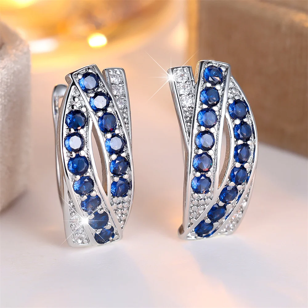 Small Round Stone Fashion Blue Crystal Hoop Earrings For Women Vintage Silver Color Ear Buckle Wedding Jewelry Mother’s Day Gift