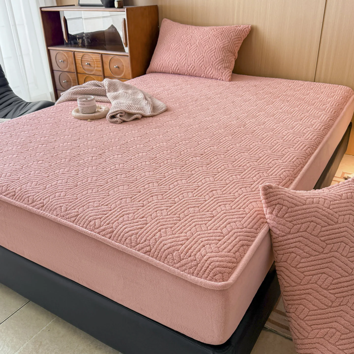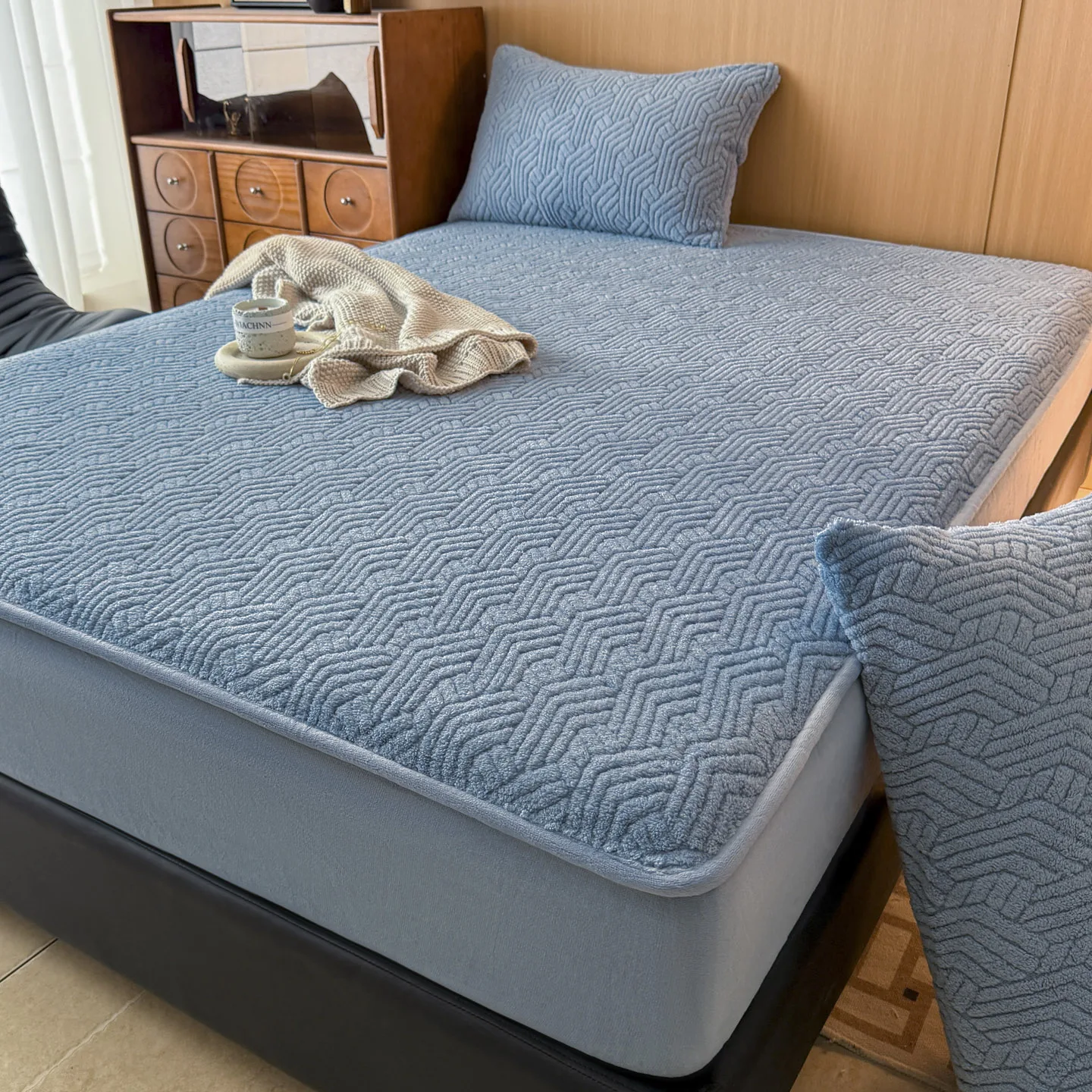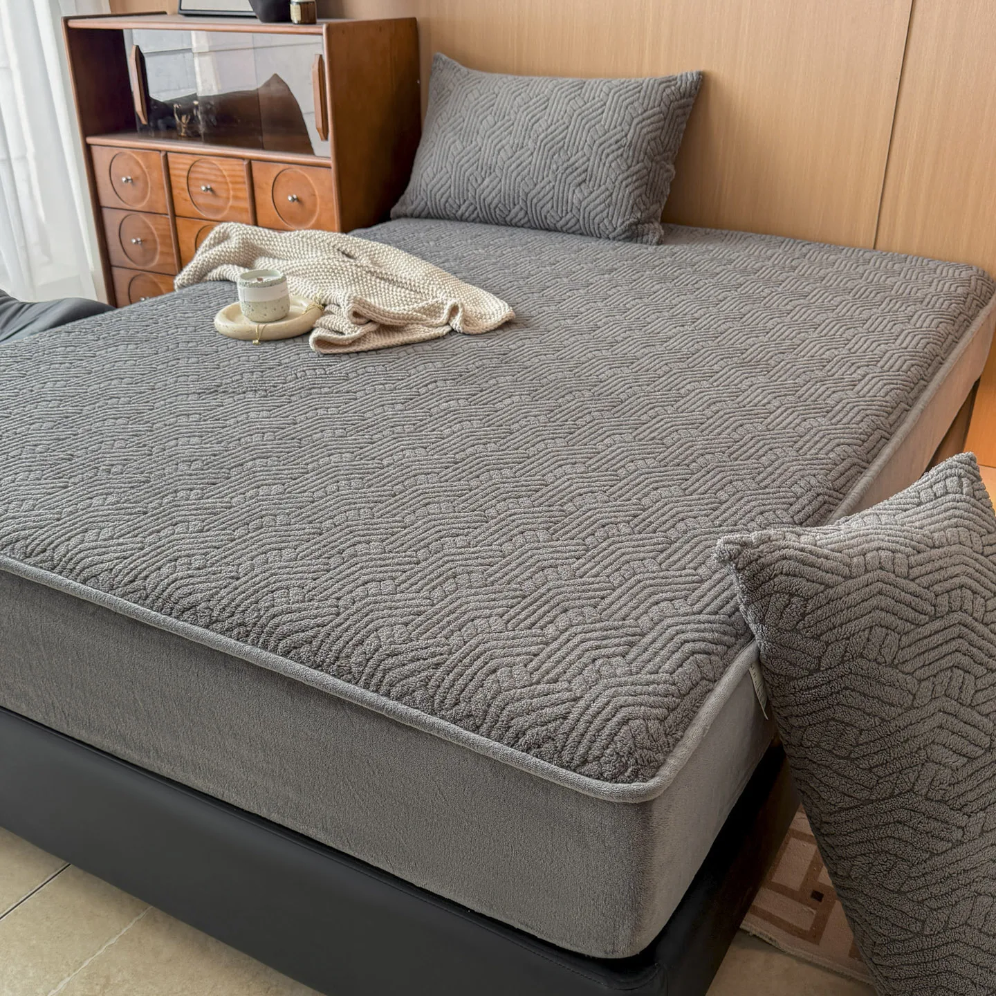 Taffeta Velvet Thickened Fitted Sheet with Pillowcases Winter Warm Plush Mattress Protector Queen Size Mattress Waterproof Cover