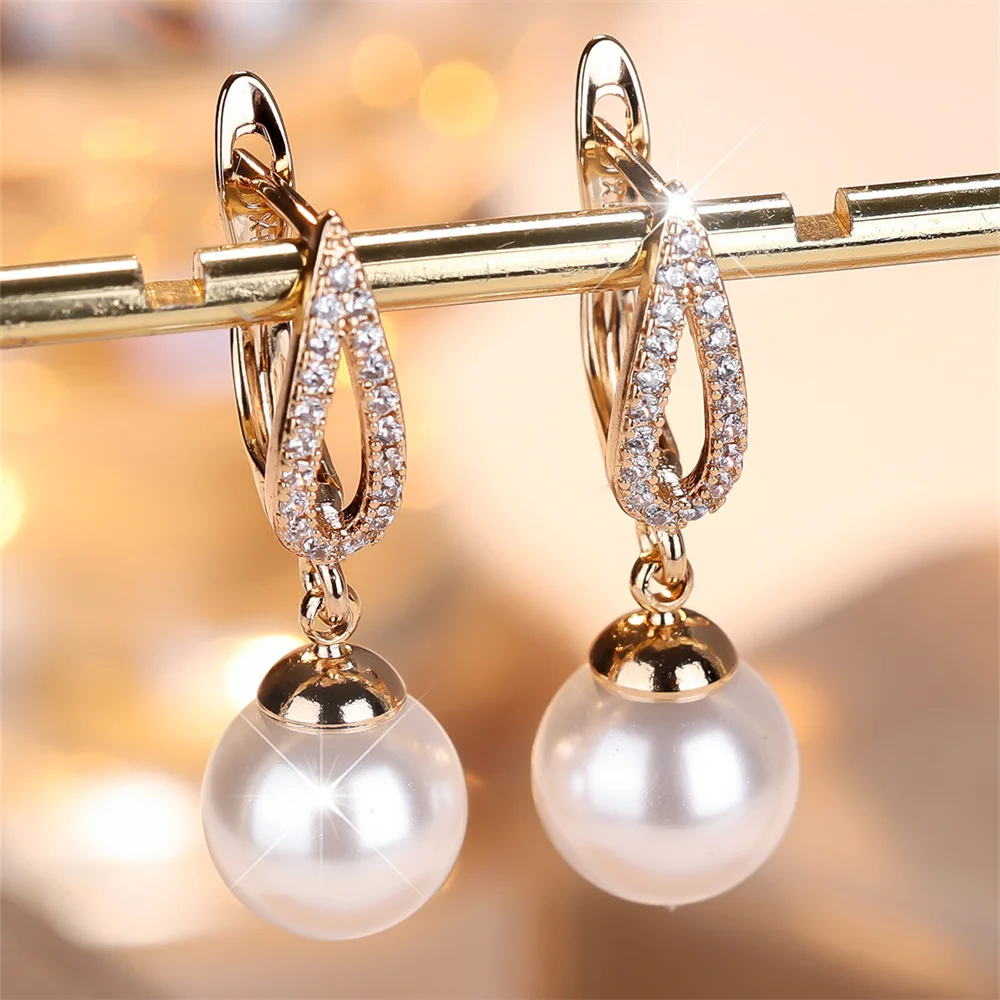 Tassel Pendant White Zircon Simulated Pearl Hoop Earrings For Women Vintage Gold Color Ear Buckle Wedding Jewelry Versatile Gift