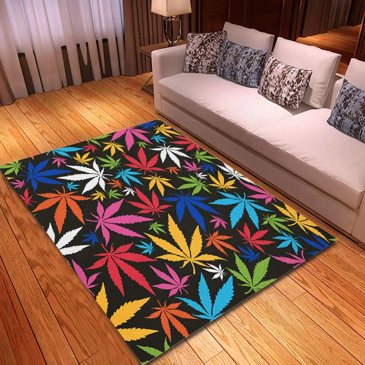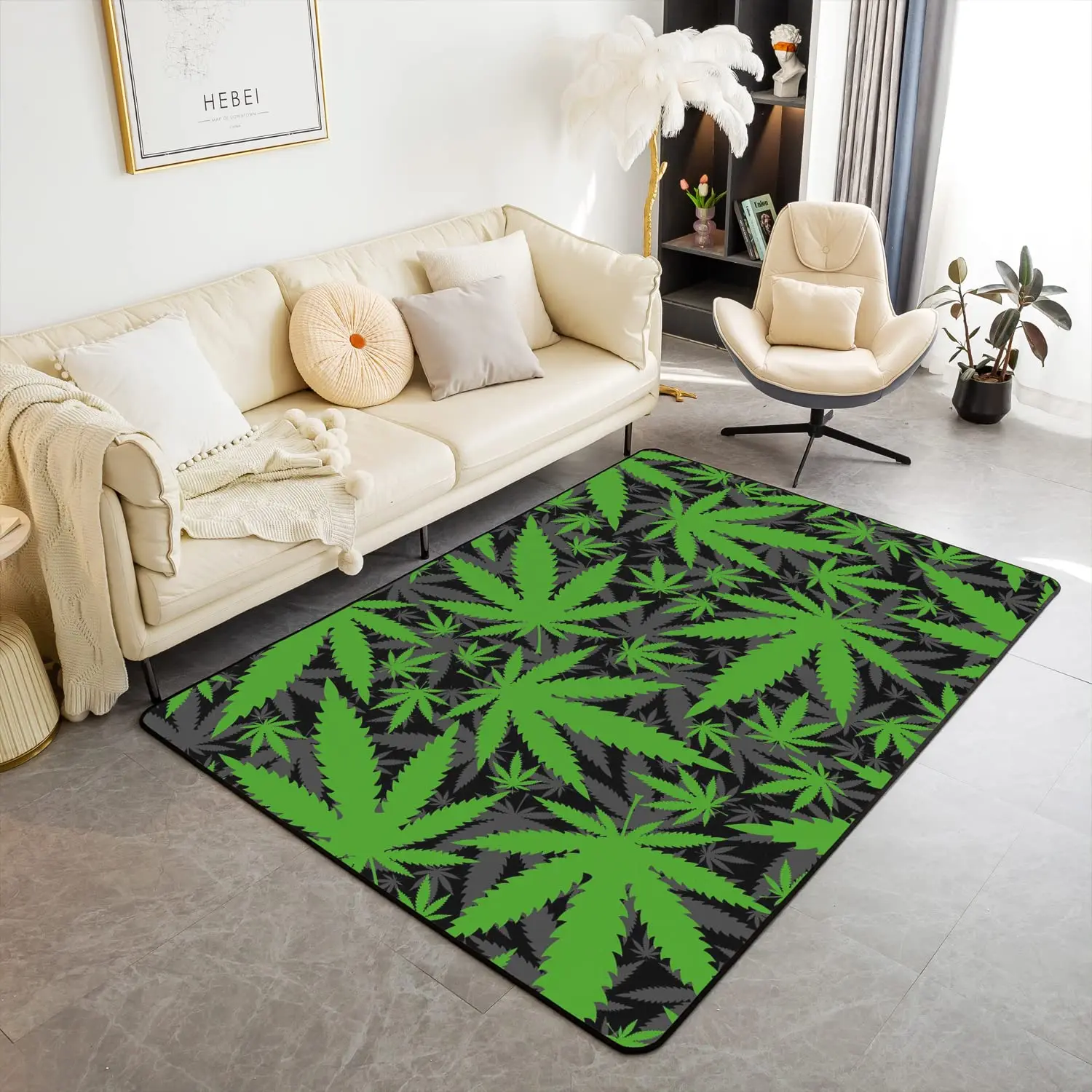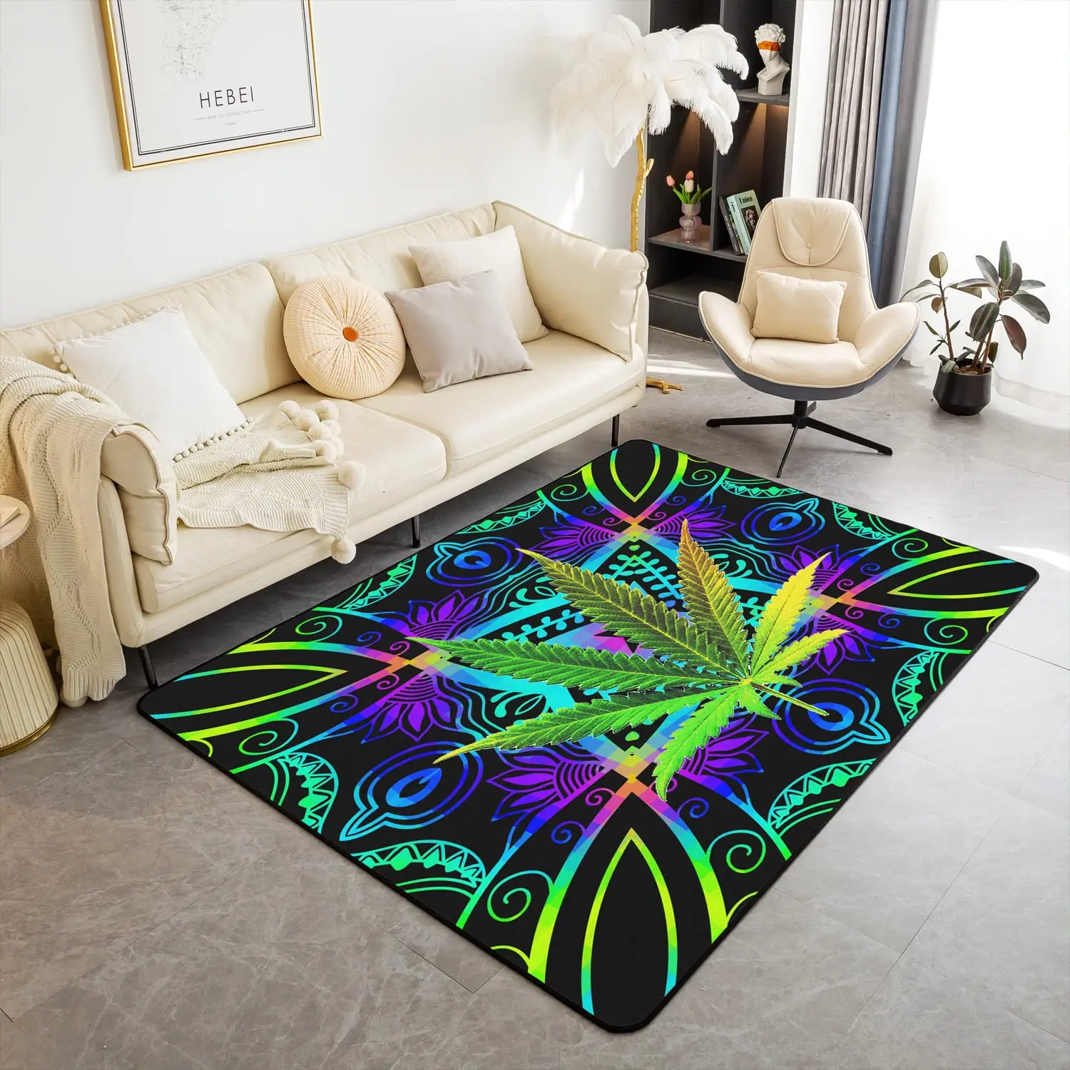 Trippy Cannabis Leaves Area Rug for Bedside Living Room Playroom, Marijuana Weed Leaf Carpet Bohemian Floor Mat Non Slip Doormat