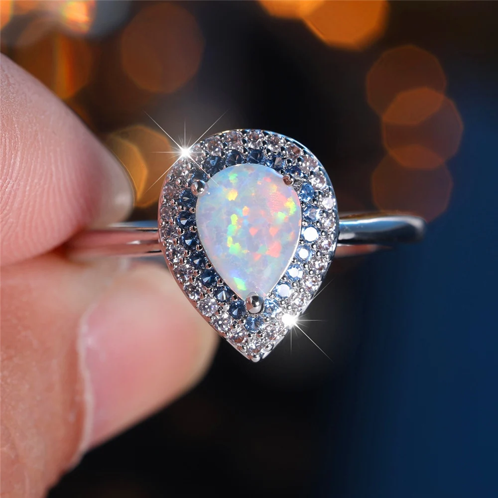 Trendy White Opal Crystal Drop Water Stone Vintage Silver Color Wedding Bands Engagement Rings For Wome Jewelry