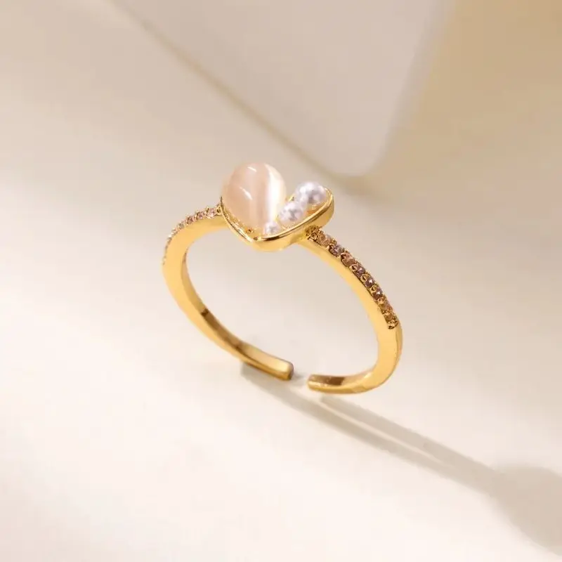 Cute Opal Heart Rings for Women Imitation Pearl Zircon Geometric Gold Color Open Adjustable Ring Aesthetic Wedding Jewelry Gift