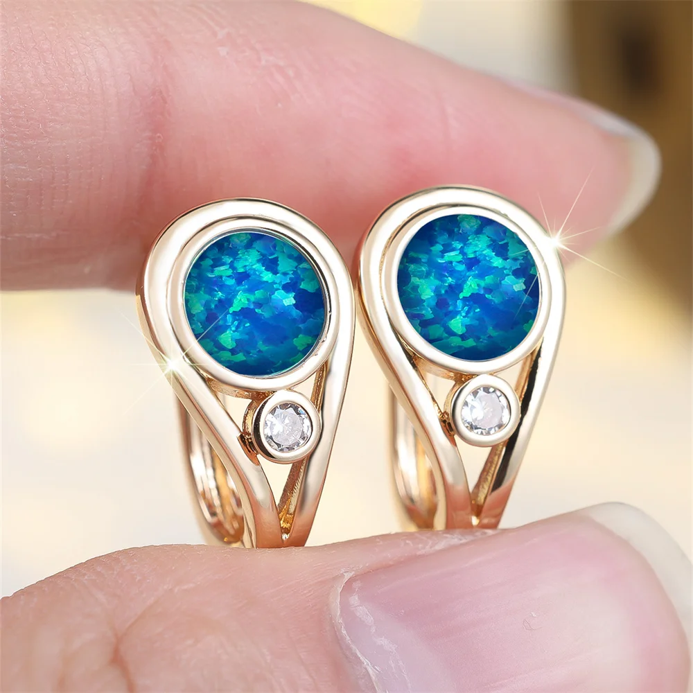 White Zircon Blue Opal Round Stone Hoop Earrings For Women Vintage Gold Color Ear Buckle Wedding Jewelry Bridal Engagement Gifts