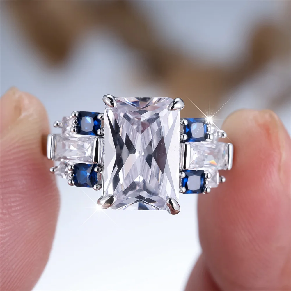 White Square Zircon Blue Stone Ring Vintage Fashion Silver Color Wedding Bands Engagement Rings For Women Men Minimalist Jewelry