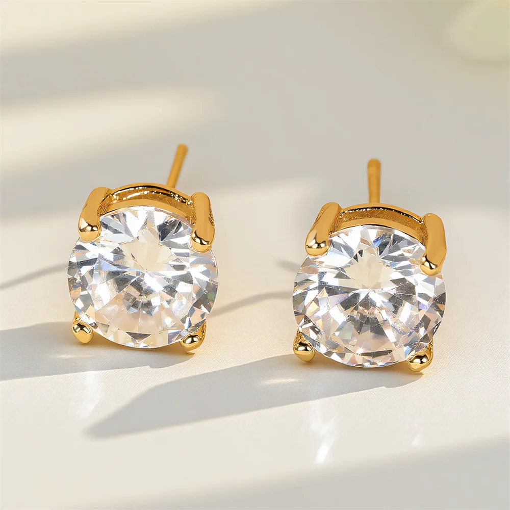 White Zircon 8mm Round Stone 4 Claws Stud Earrings For Women Fashion Crystal Gold Color Wedding Earring Versatile Jewelry Gifts