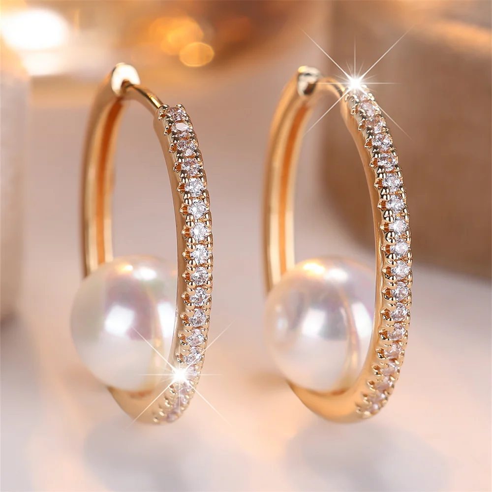 White Zircon Round Simulated Pearl Hoop Earrings For Women Vintage Fashion Gold Color Ear Buckle Wedding Jewelry Versatile Gifts