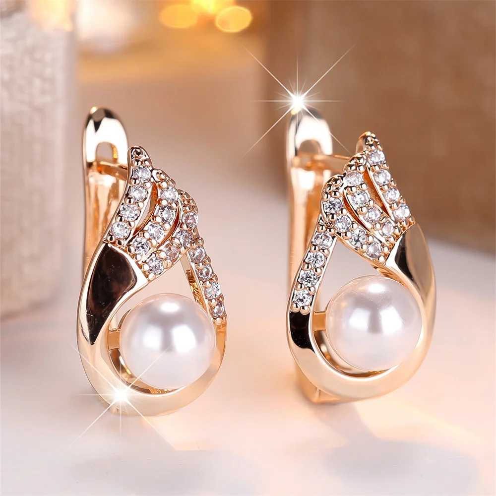 White Zircon Stone Luxury Simulated Pearl Hoop Earrings For Women Vintage Gold Color Ear Buckle Wedding Jewelry Versatile Gifts