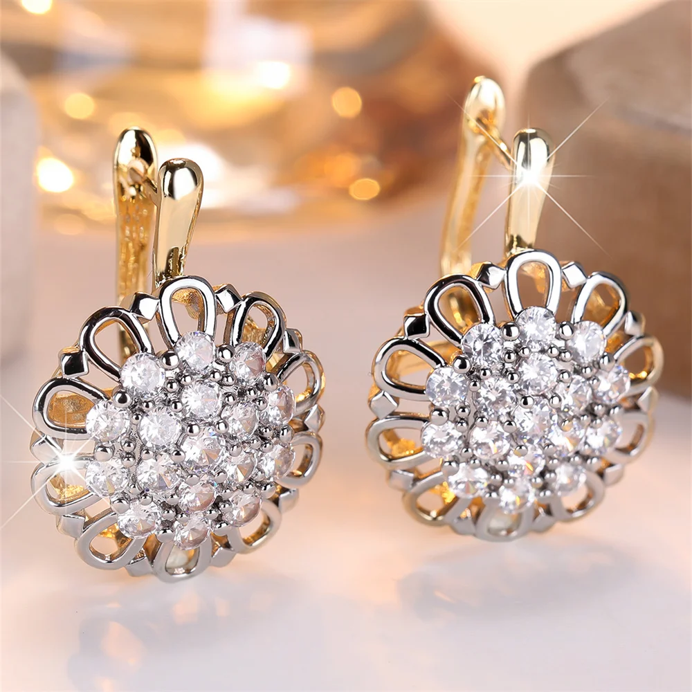 White Zircon Vintage Hollow Flower Hoop Earrings For Women Antique Gold Silver Color Ear Buckle Wedding Jewelry Versatile Gifts