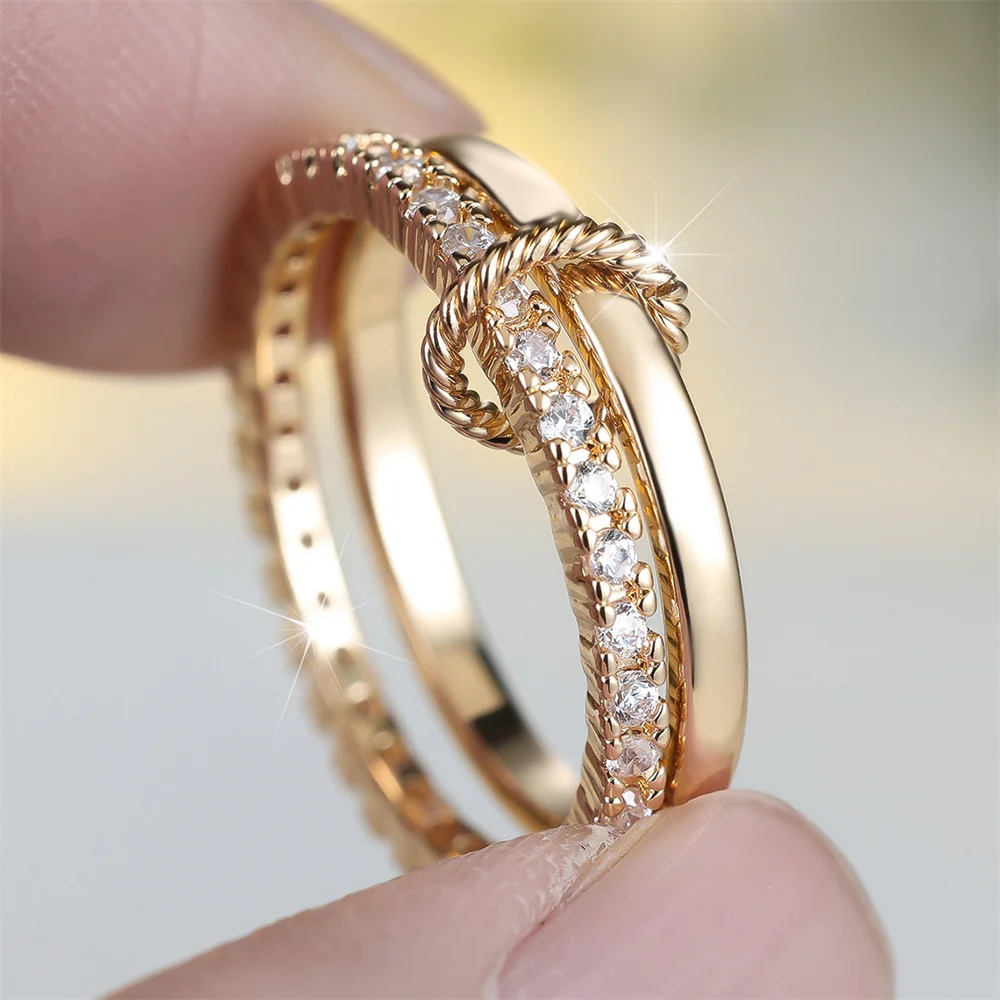 White Zircon Single Row Round Stone Ring Sets For Women Vintage Gold Color Engagement Bands Wedding Jewelry Set Versatile Gifts